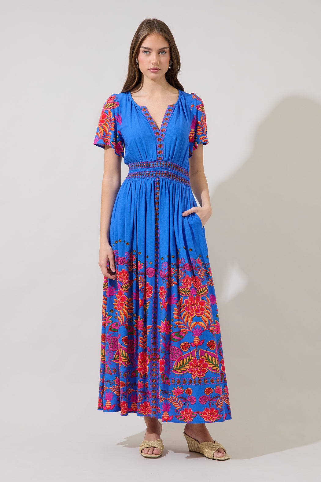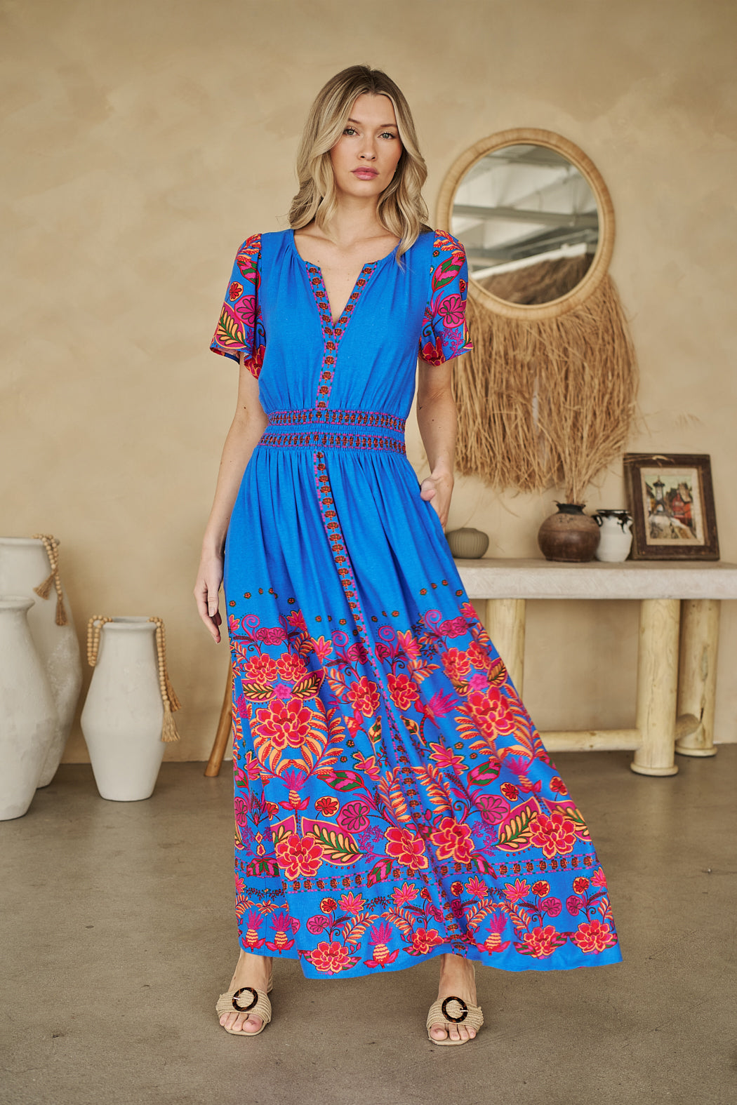 One of a kind! This beautiful blue linen maxi dress features short sleeves with a split neckline in down the middle. It has a smocked waistband with pockets on each side. The border floral print throughout the dress gives it that extra pop. Just add on heels or sandals to complete your look.