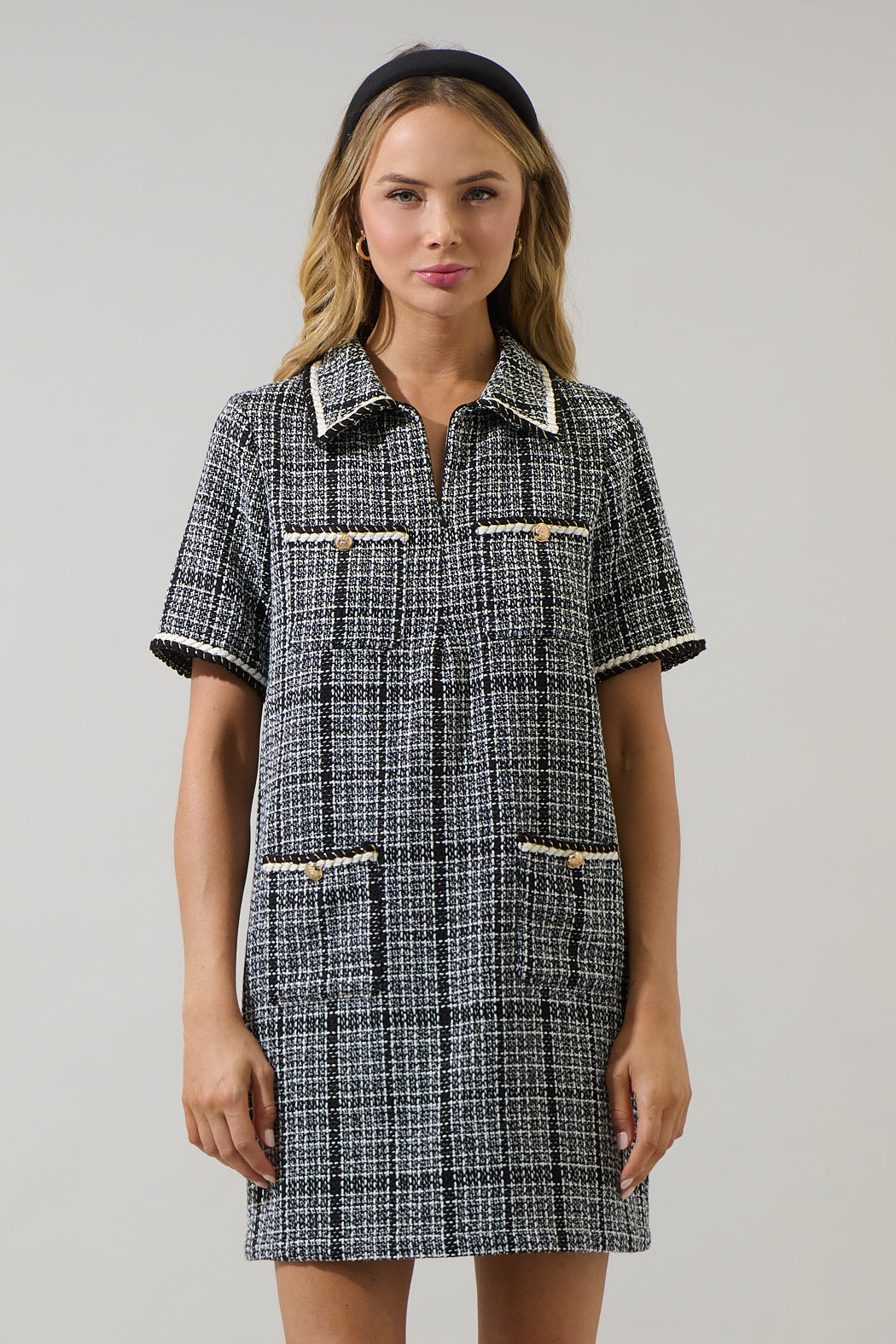 Bring polished sophistication to any moment with a dress that feels effortlessly chic. This tweed mini dress features a collar neckline, short sleeves, a front zipper, braided trim on the sleeves, pockets, and collar, plus gold button accents. Style it with heeled boots and a crossbody for a modern day to night look.