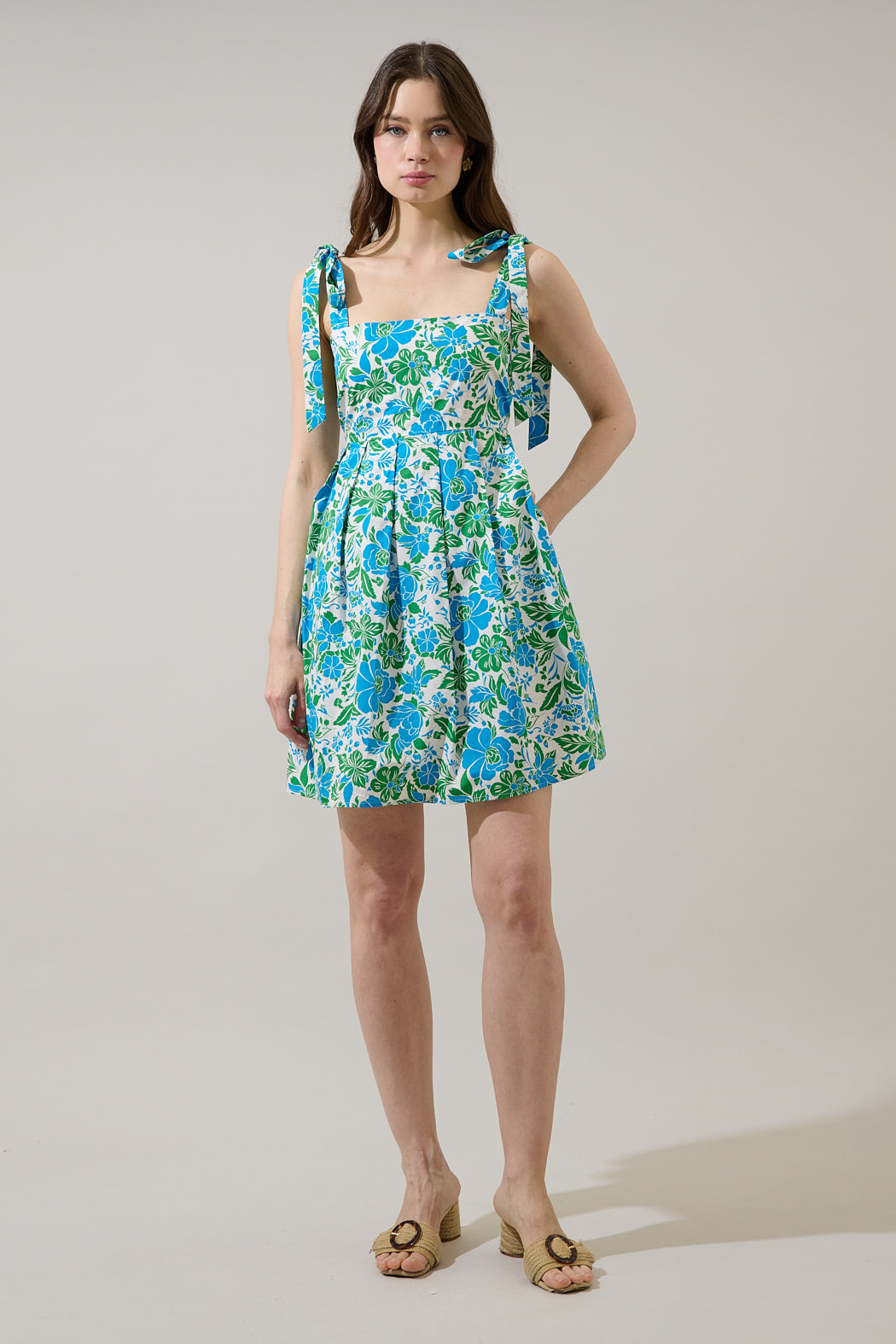 Embrace vibrant summer style with this darling mini dress, featuring a striking blue and green floral print against a crisp white background. The square neckline and gathered A-line skirt create a flattering silhouette, while the tie shoulder straps add a sweet detail. Complete your look with wedges or sandals for a fresh look.