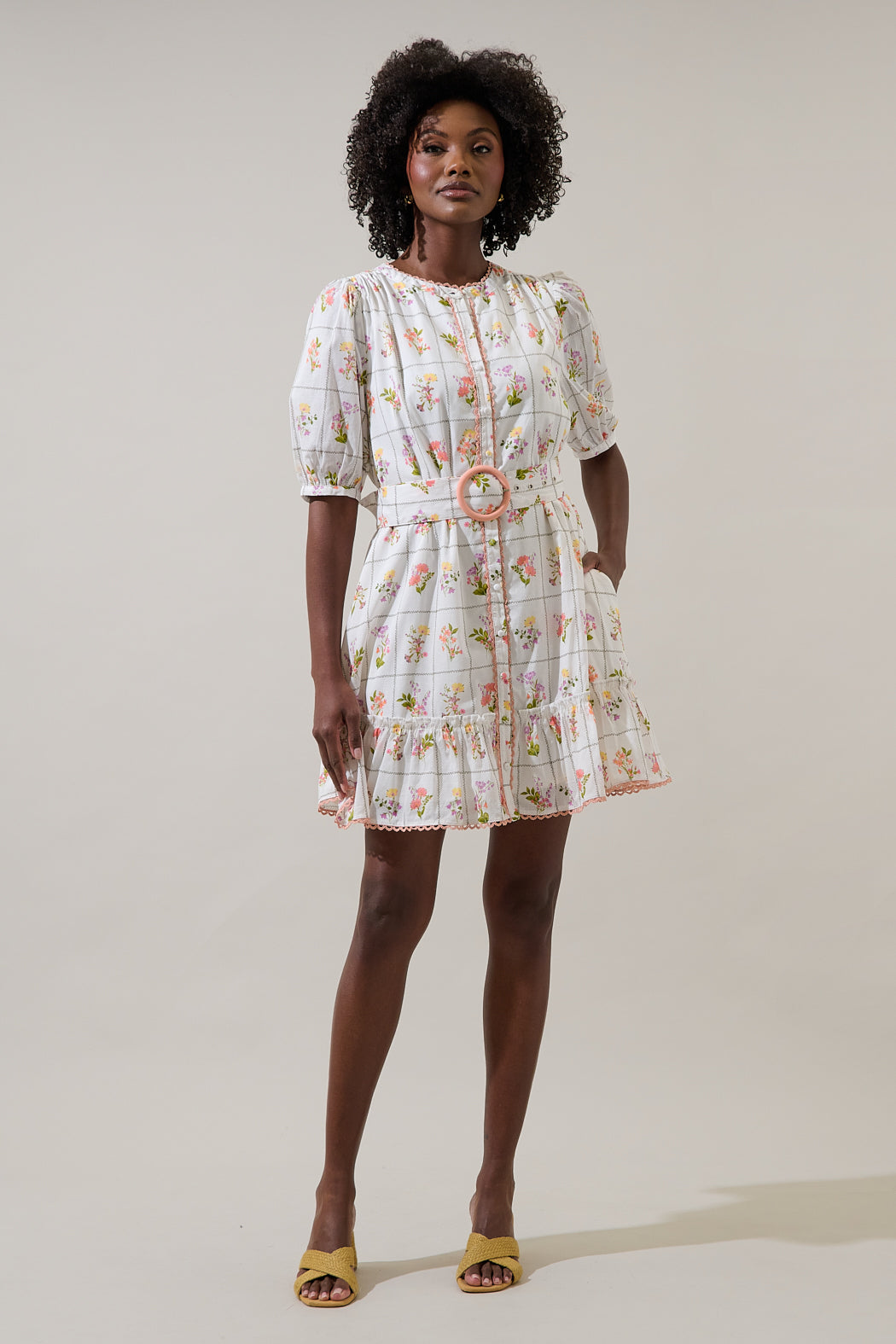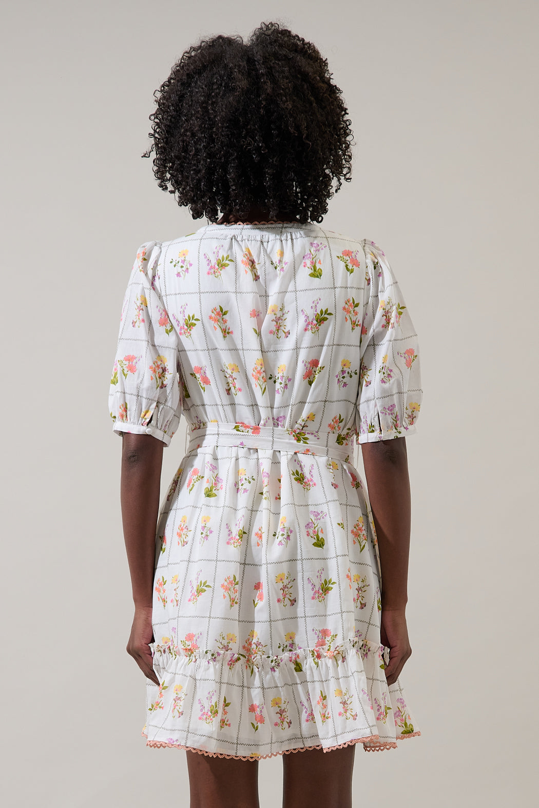 Embrace spring with this mini dress, showcasing a delicate wildflower motif set against a crisp checked background. The subtle pom-pom trim accents the hemline, adding a fun detail to the tiered skirt. With short puff sleeves and a sophisticated banded collar, this piece is perfect for warm weather occasions.