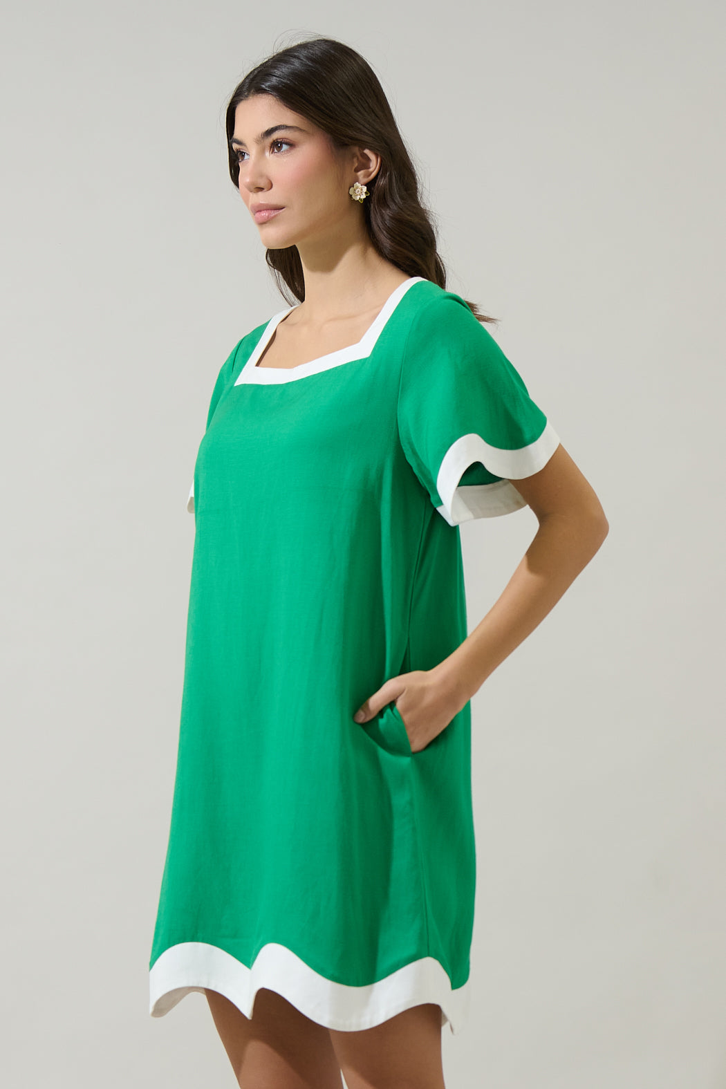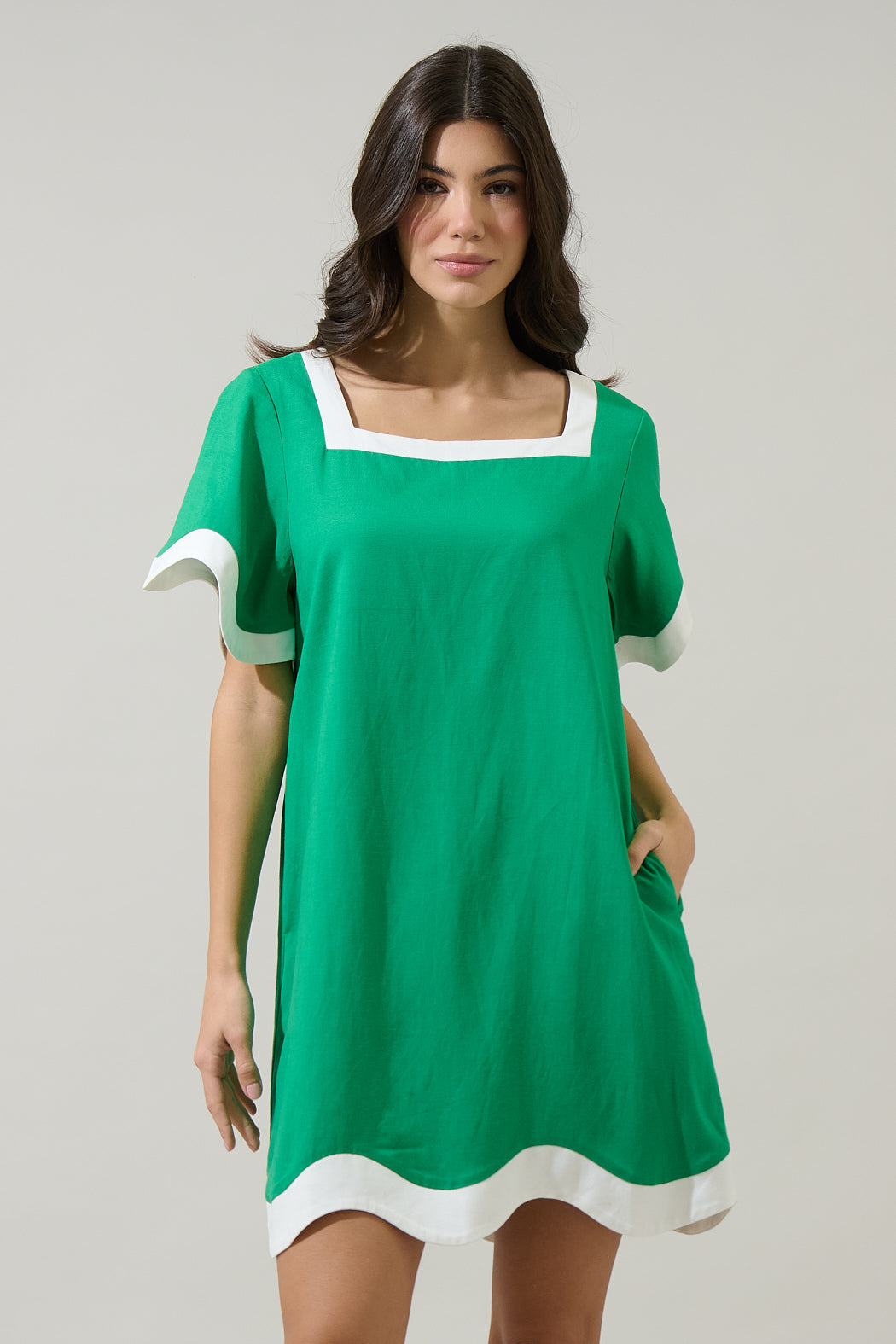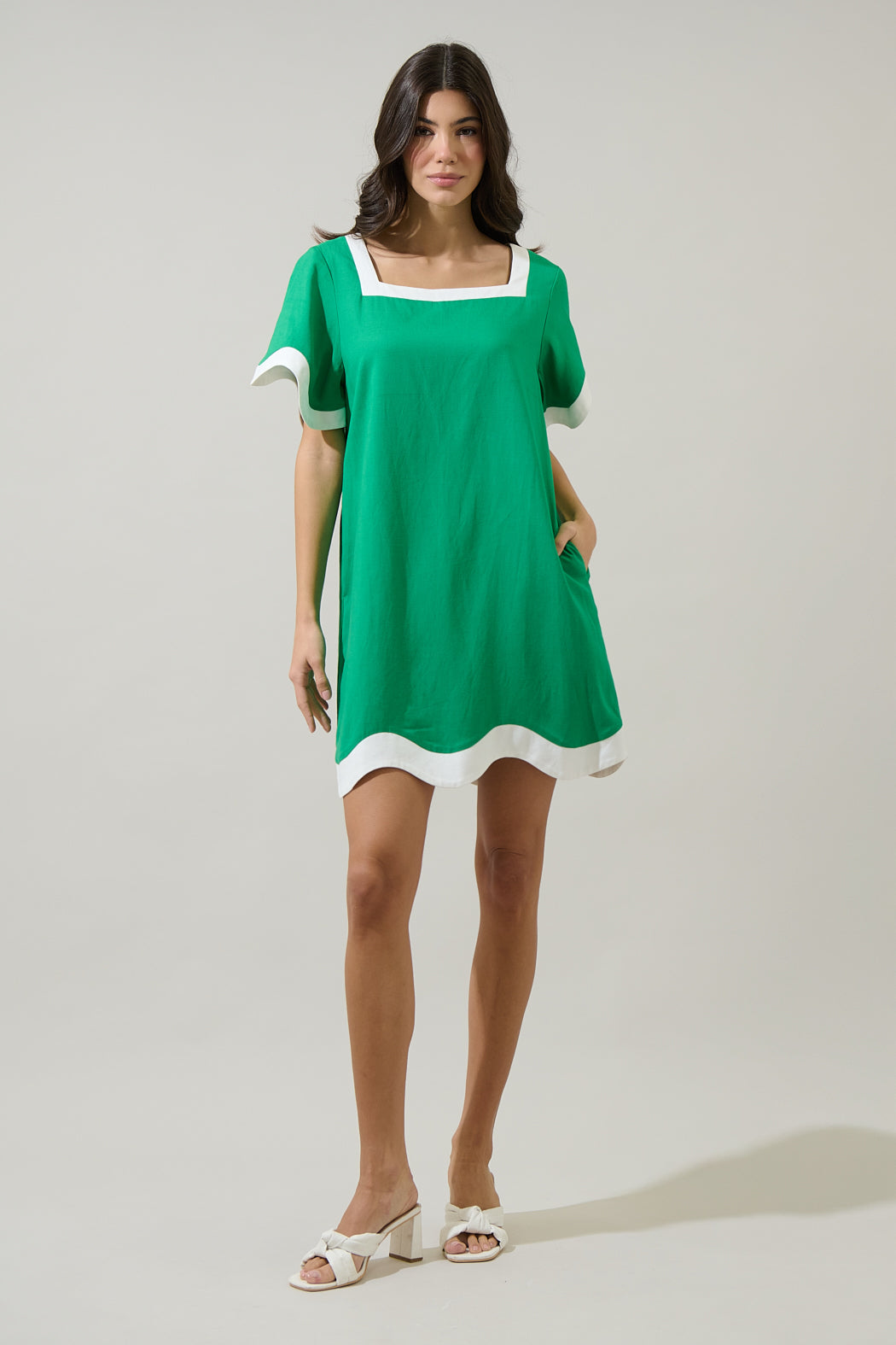 The Gizelle Scallop Shift Mini Dress is your go-to piece for sunny days and vacation vibes. Designed in a striking color with crisp white contrast trim, this A-line silhouette flatters with its relaxed fit and playful movement. The square neckline and short sleeves create a modern shape. Wear it with slide sandals and oversized sunnies for a resort-ready look.