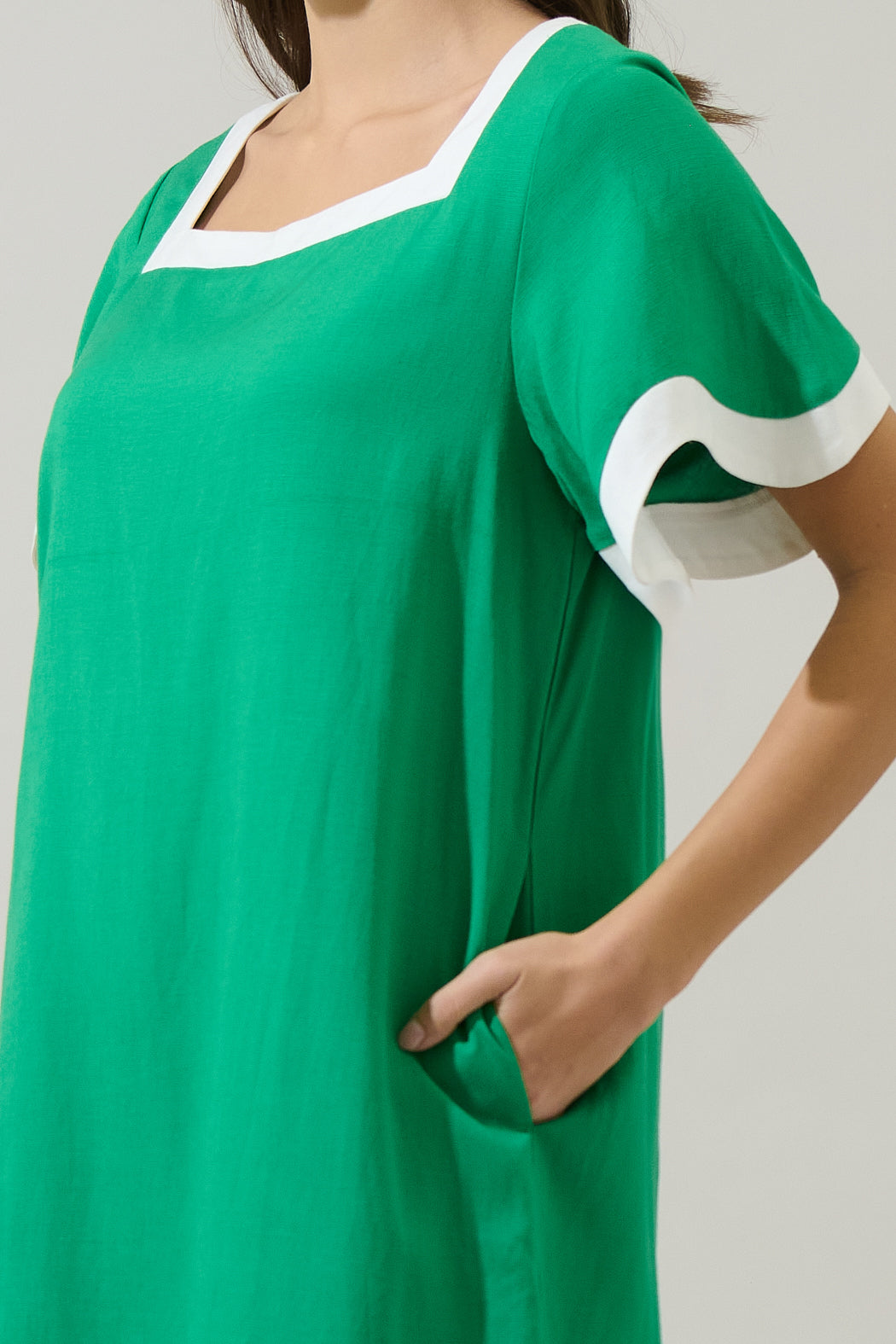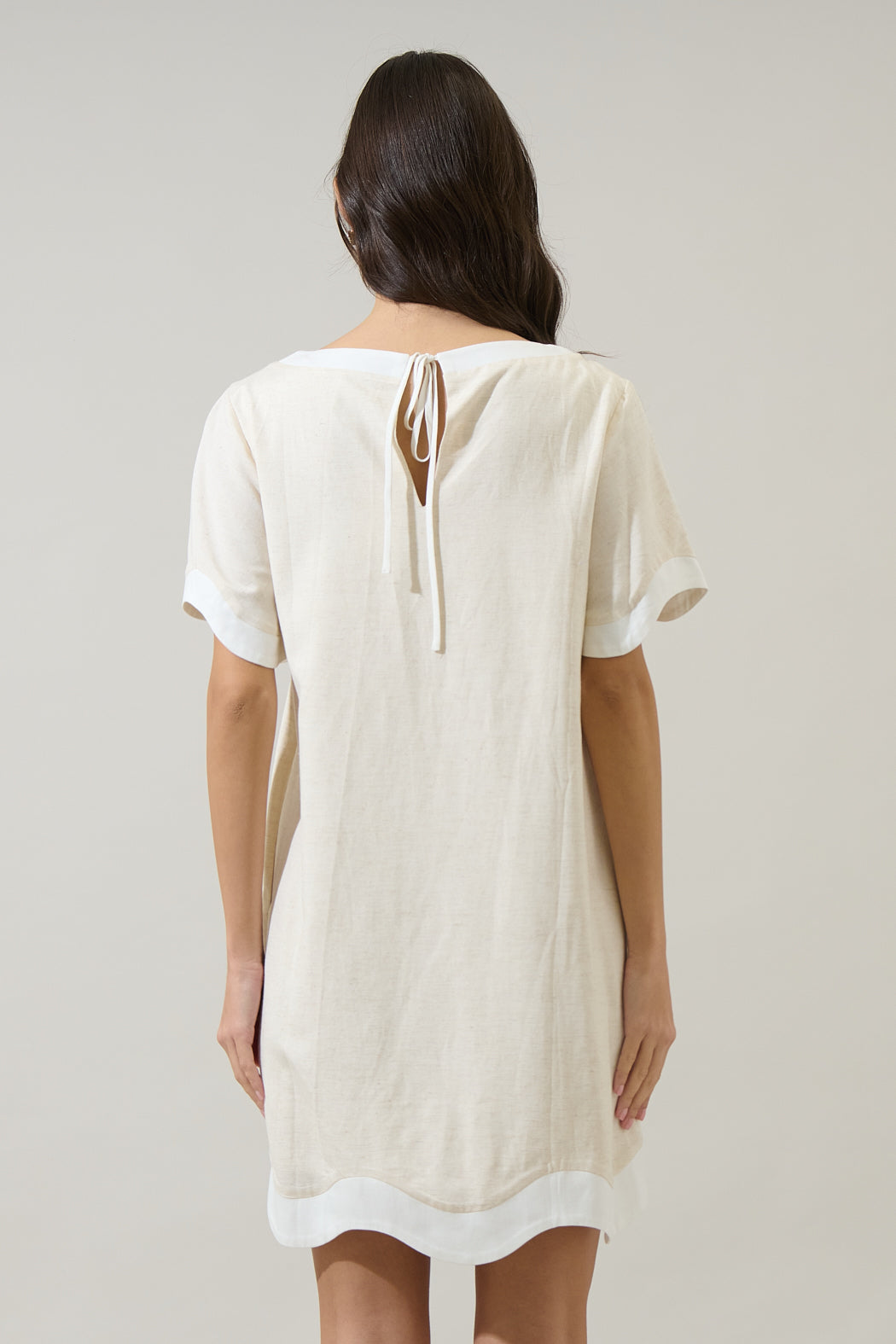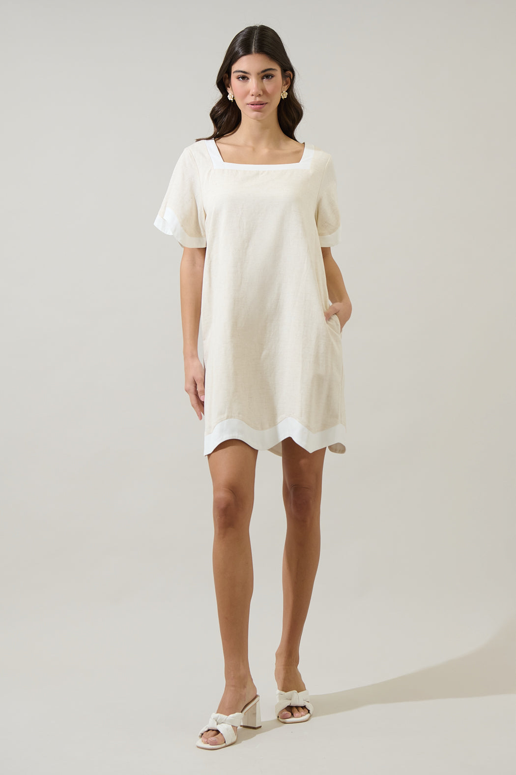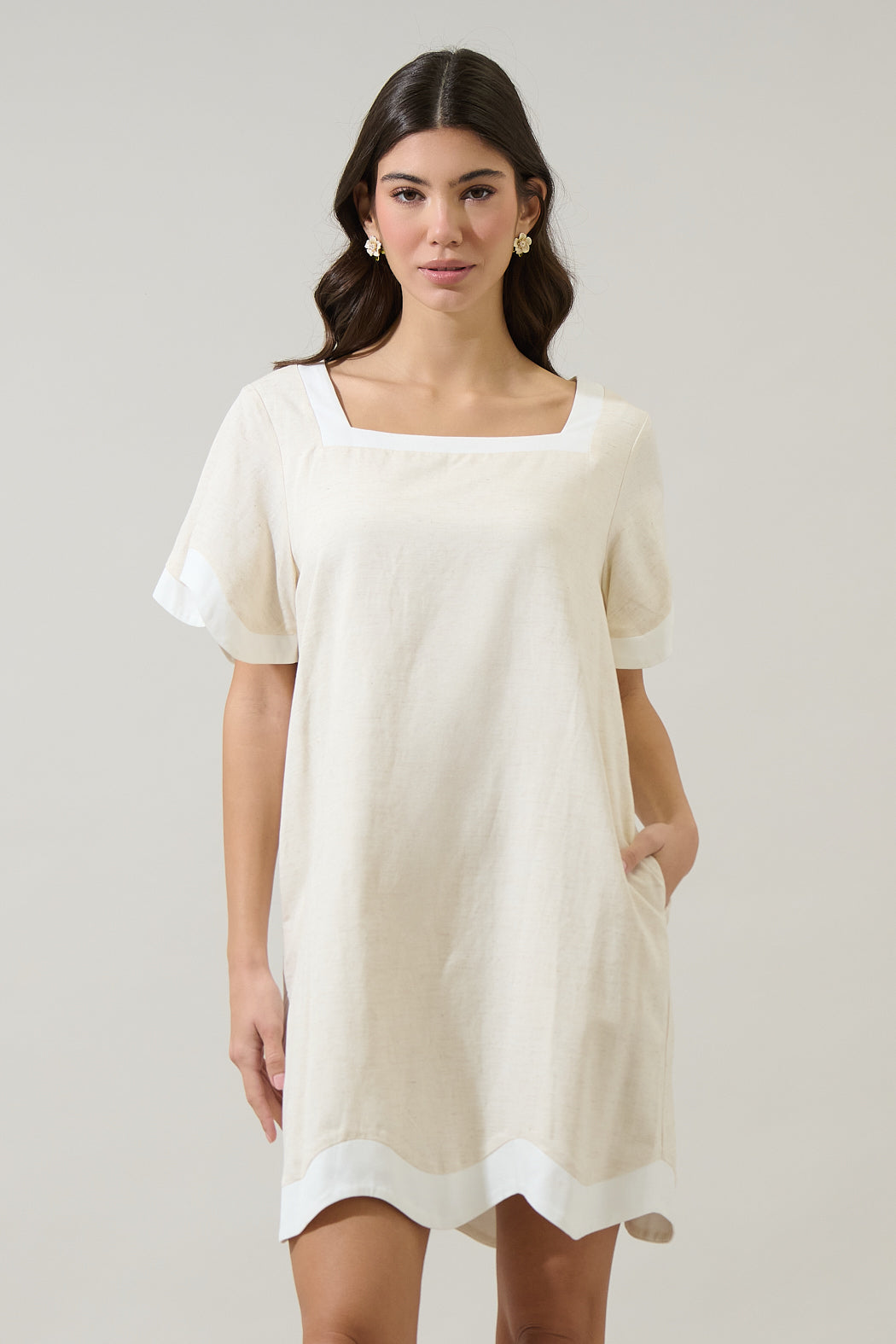 The Gizelle Scallop Shift Mini Dress is your go-to piece for sunny days and vacation vibes. Designed in a striking color with crisp white contrast trim, this A-line silhouette flatters with its relaxed fit and playful movement. The square neckline and short sleeves create a modern shape. Wear it with slide sandals and oversized sunnies for a resort-ready look.
