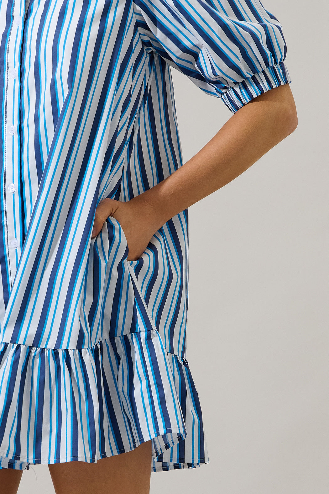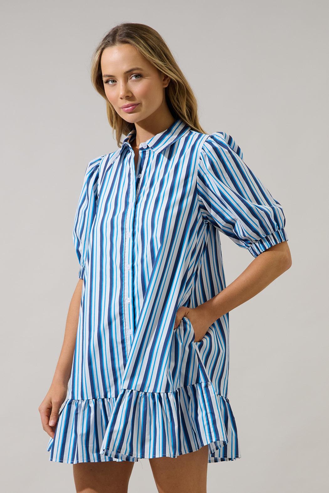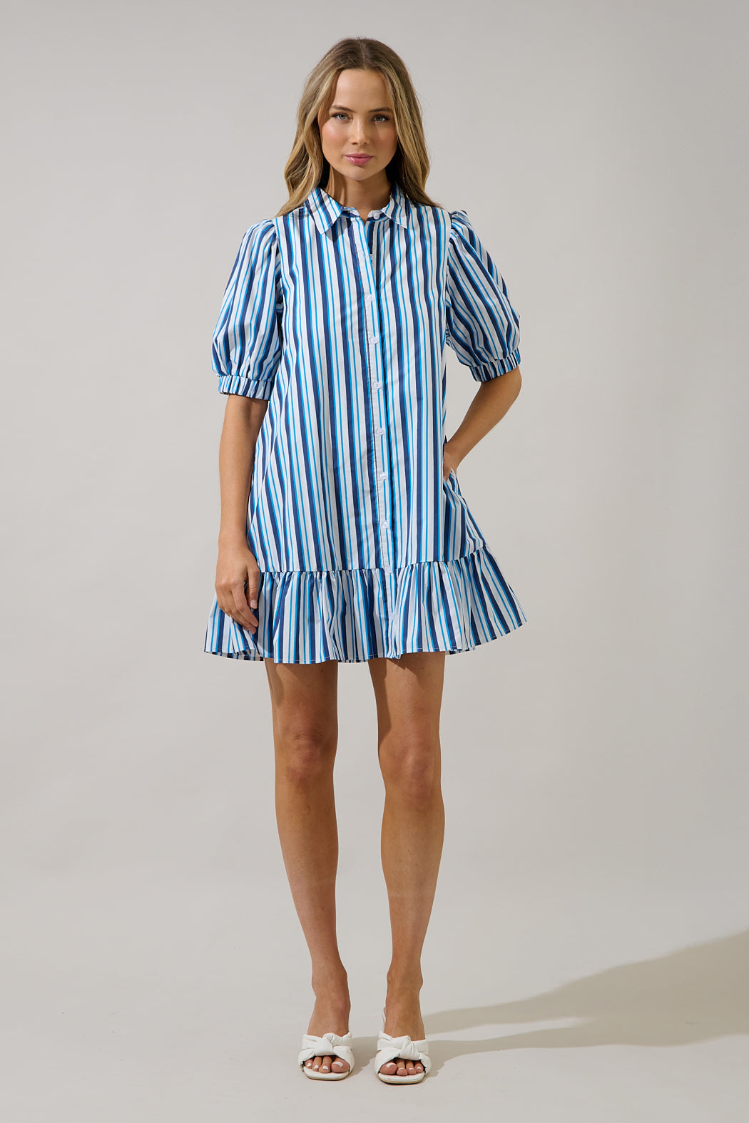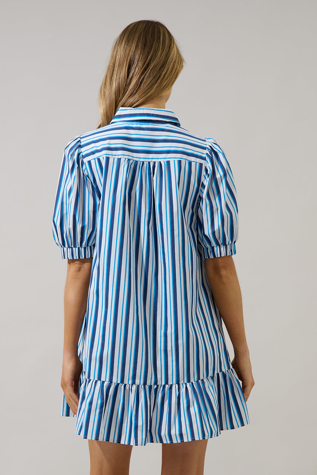 Take a twirl and turn some heads in the Norra Striped Levy Button Down Shift Dress. It features a classic collar with a functional button front detail, while short bubble sleeves frame a shift silhouette with a drop ruffle waist. Pair it with heels.