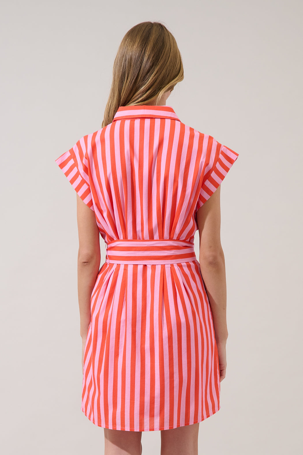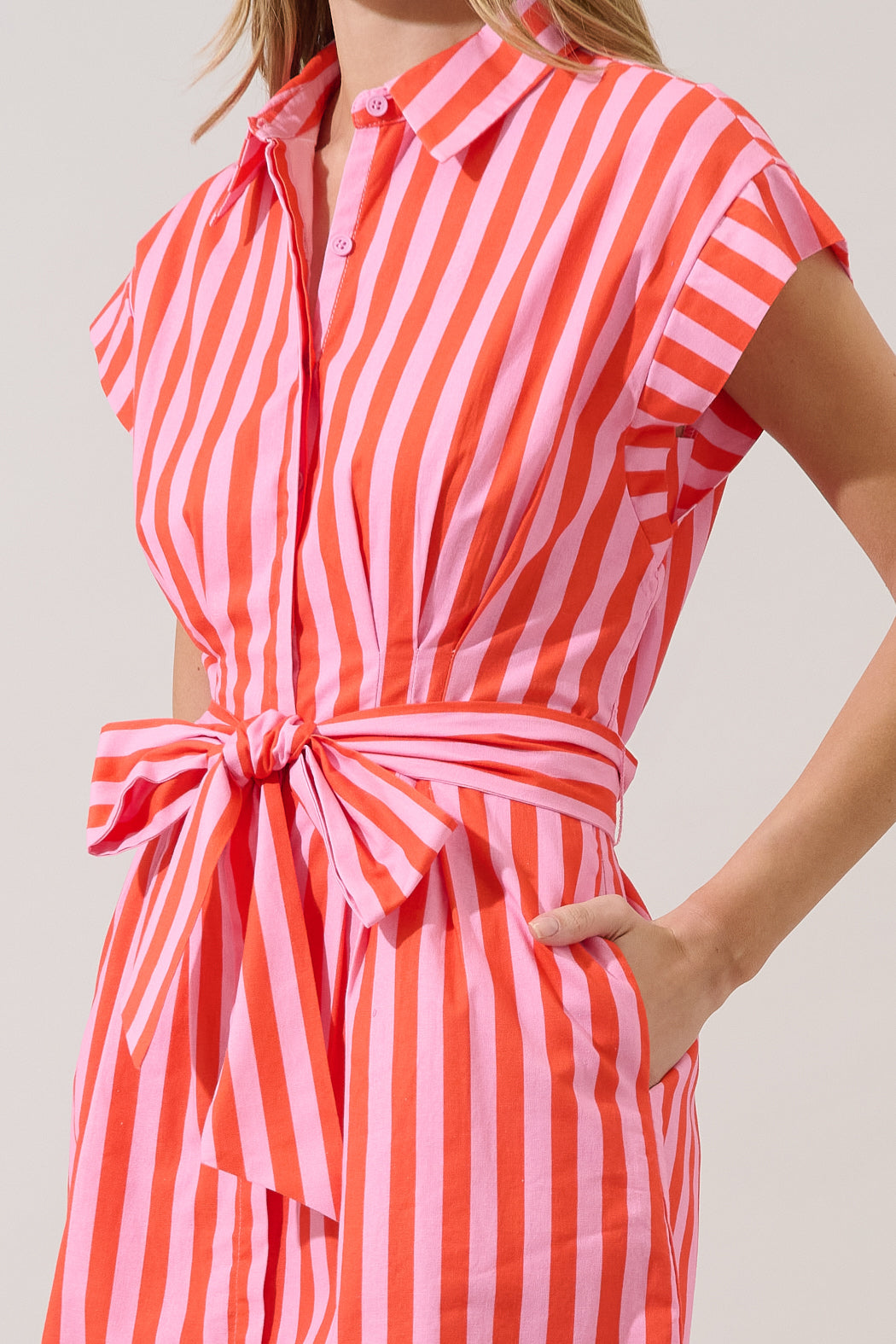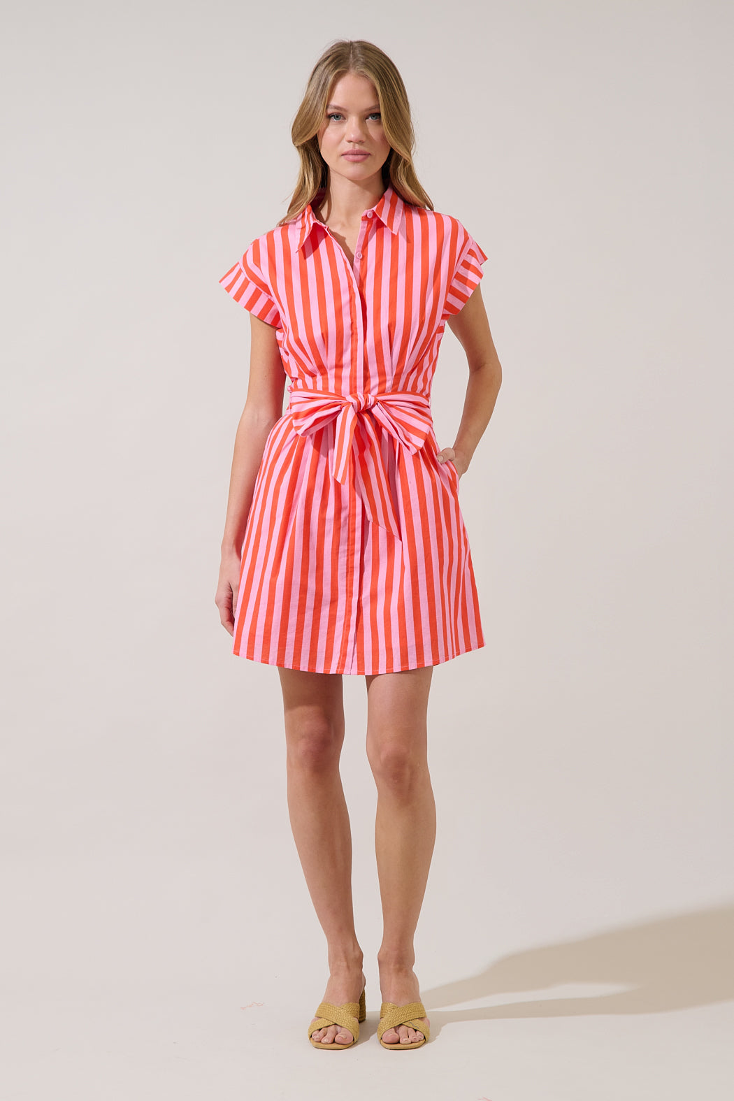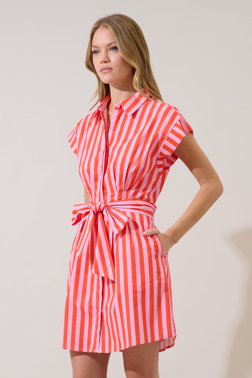 Step into style with this bold striped shirt dress, featuring ruffled cap sleeves and a waist defining bow for the perfect pop of color. It has collared neckline, hidden button down front, and unique ruffled cap sleeves for a playful touch. Pair the look with strappy heels.