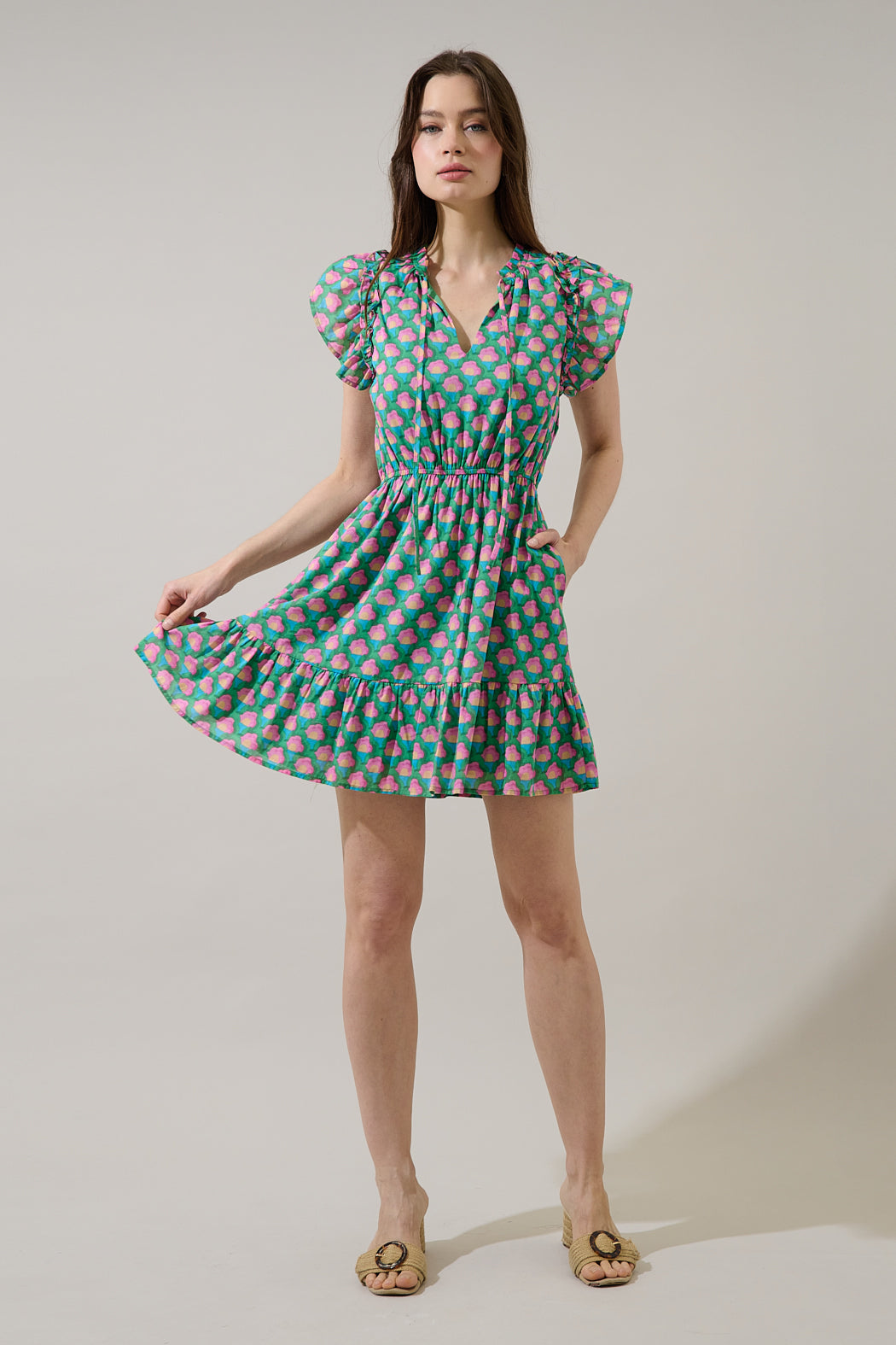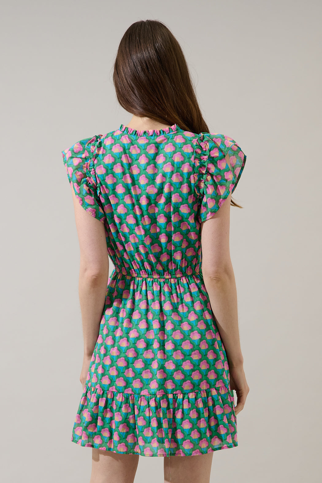 Bloom with confidence! This playful mini features a vibrant geometric floral print and a flattering smocked waist. It’s finished with breezy flutter sleeves and a ruffled hemline for effortless movement. Pair it with pink strappy heels.