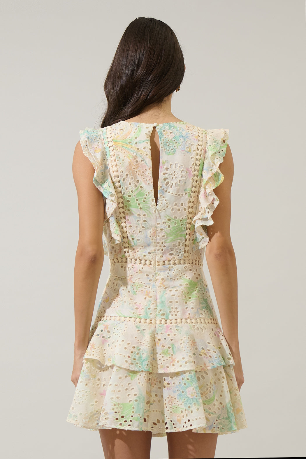 Keep it light and youthful in this mini dress. Made of a eyelet fabric, it features a classic round neck with ruffle details that start from shoulder to waist to create a faux cap sleeve. Wear it out to brunch with heels for a cute look.