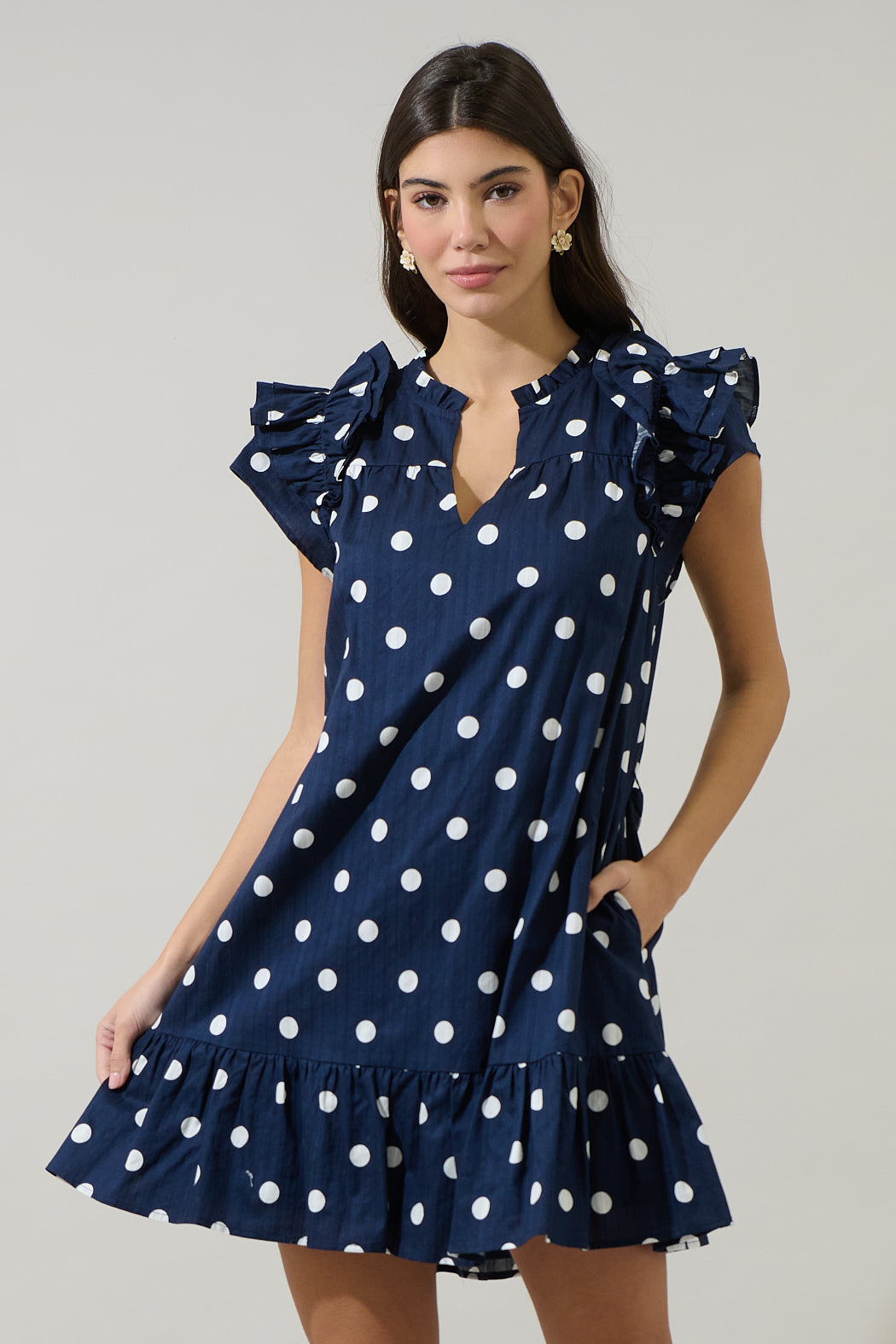 Say hello to your new go to polka dot moment! This navy dress features charming ruffle sleeves, a waist defining tie belt, and a flirty tiered hem for effortless movement. Easy to pair with white or blue heels.