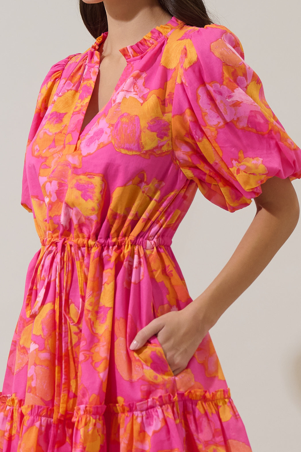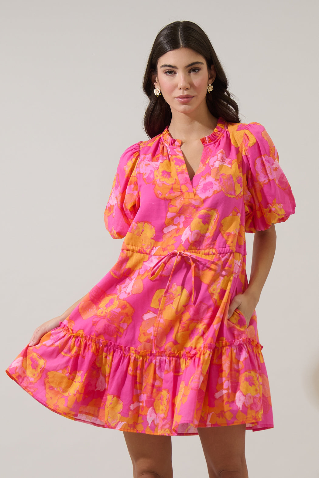 Easy, breezy, and bursting with florals. This mini dress features short puff sleeves framed by a split neckline with ruffles around the edge. Keep it as shift style or use the string tie to adjust around your waist. Combine it with heels for a cute look.