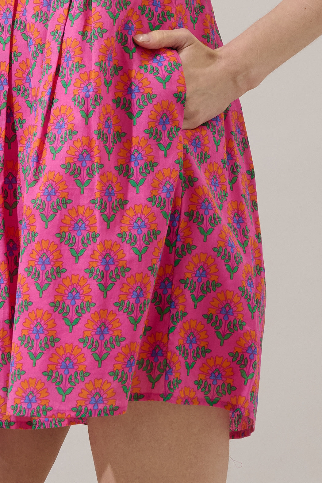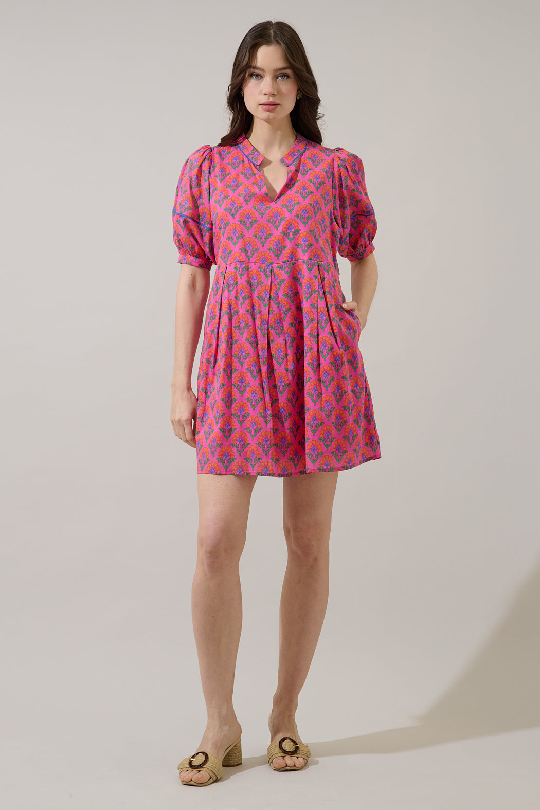 Lunches on the patio and afternoons in the garden just got a little cuter in this dress. Designed with a playful floral pattern, it features a flattering split neckline, short puff sleeves, and convenient pockets for a touch of function. Pair it with a nude clutch and strappy sandals.