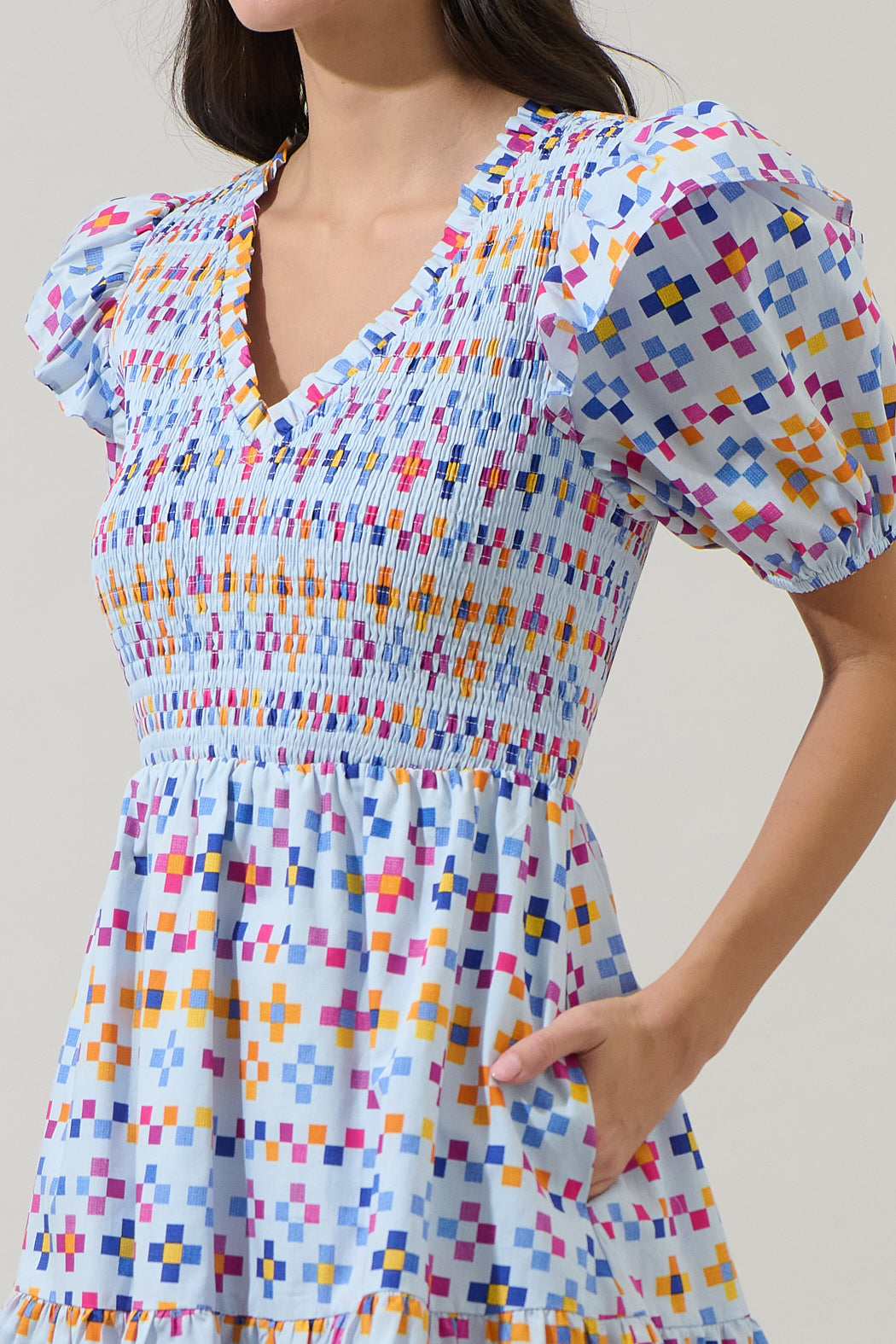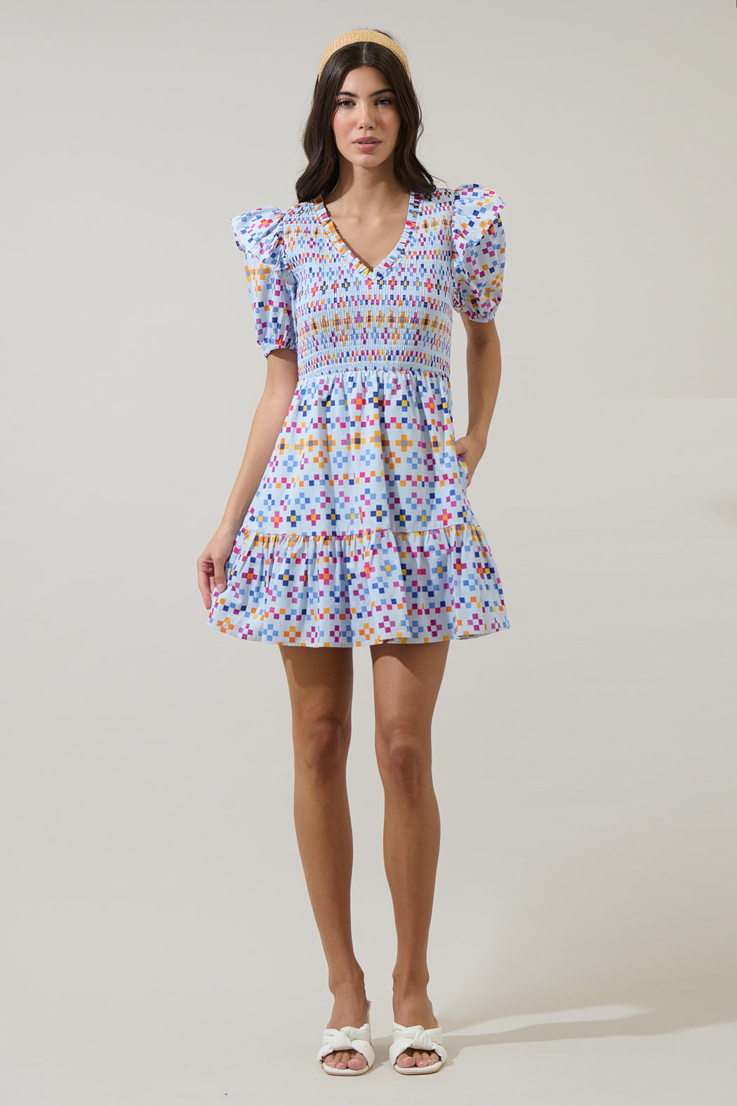 Bold, playful, and full of personality is what this dress will make you feel. Features a ruffle trim V neckline and fully smocked bodice framed by short puff sleeves. It tops a flared ruffle tier mini skirt. Wear it white heels and gold accessories.