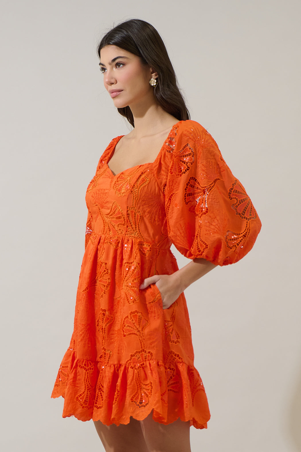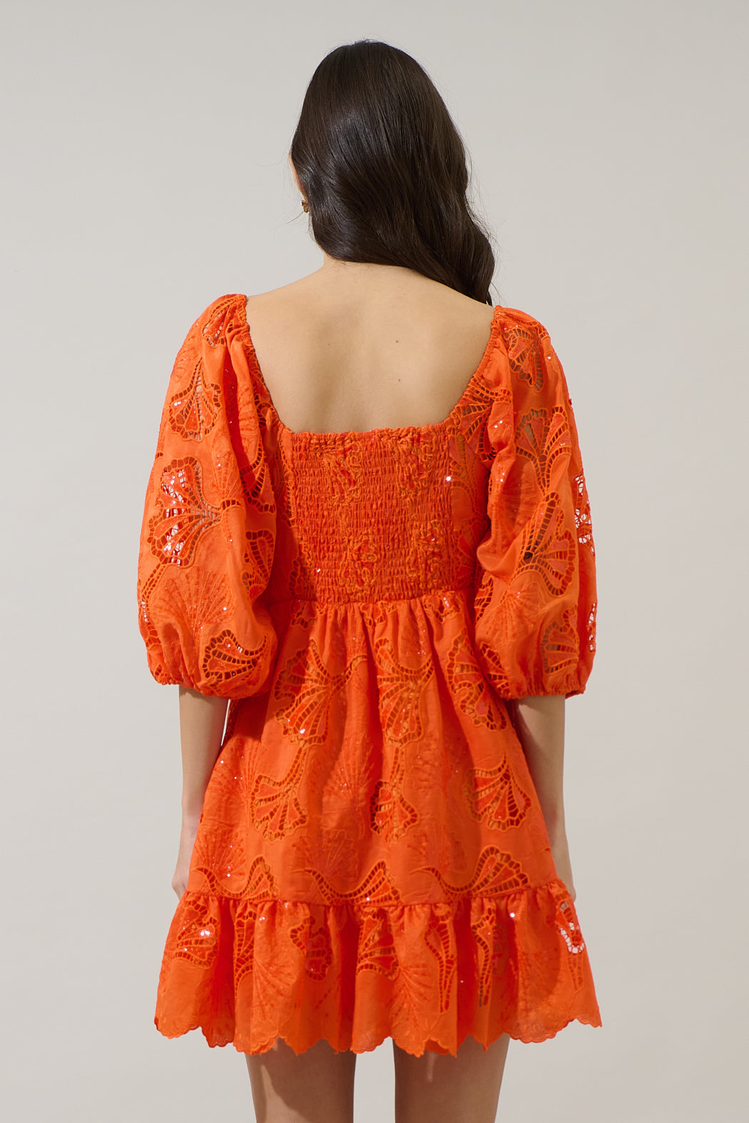 You'll be the crush of the season in this charismatic mini dress. An adorable eyelet design shapes this mini dress, with embroidery throughout, that has short bubble sleeves with a sweetheart neckline. A smocked back and mini ruffle hem go along perfectly. Wear this mini with strappy heels.
