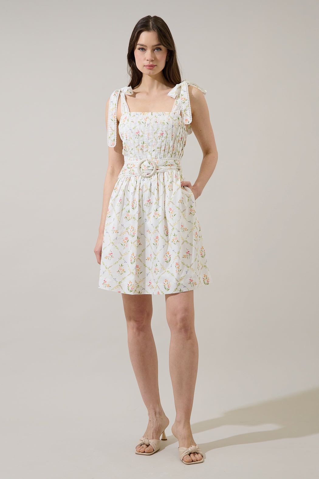 Step into a blooming garden with this charming floral mini dress. This piece features a delicate square neckline with dainty tie shoulder straps and a matching woven belt that perfectly defines the waist. Perfect for your next brunch date.