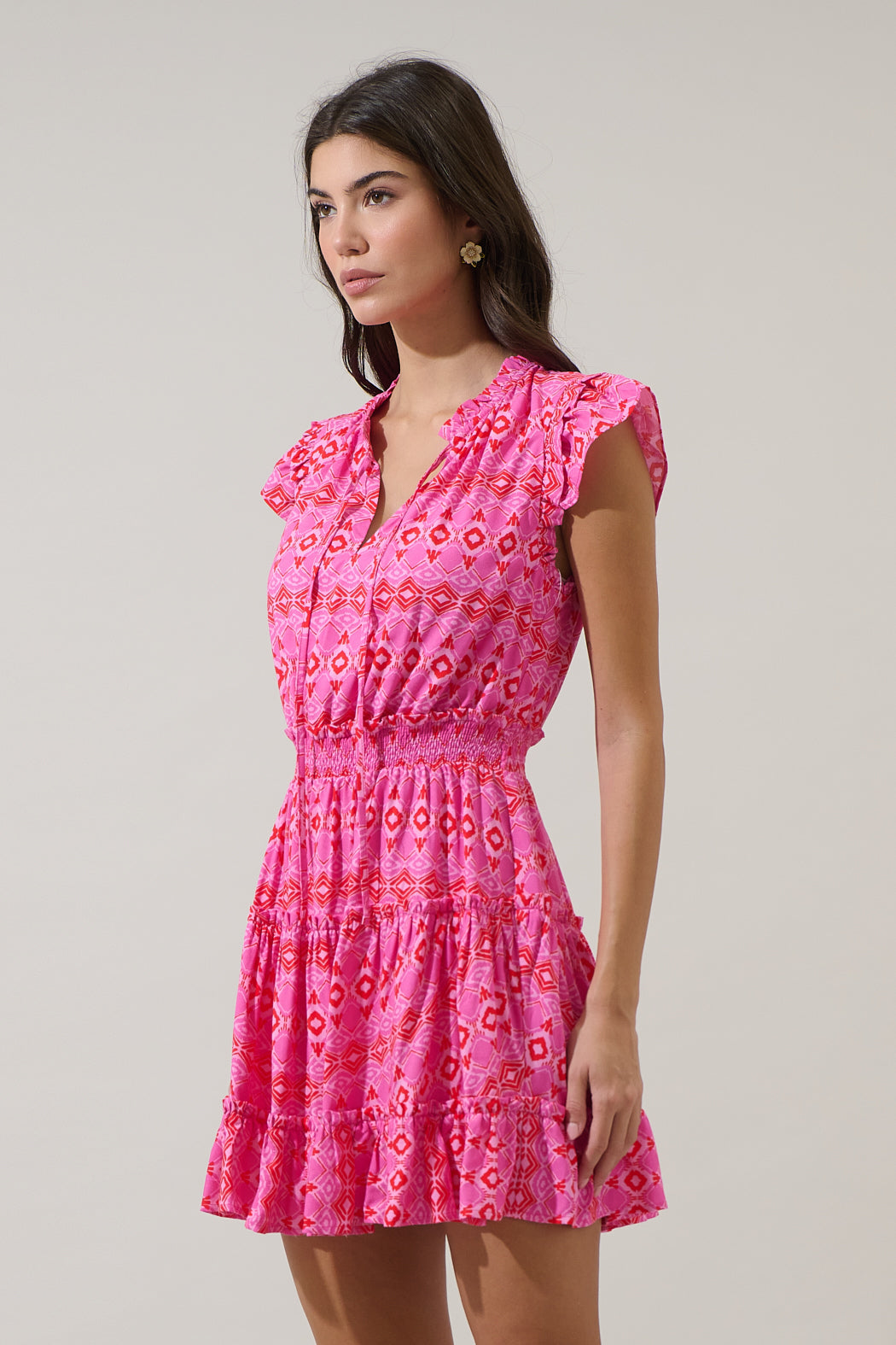 This dress is easygoing and it’s perfect for sunny days or a casual night out. Ruffle trim cap sleeves frame a split neckline that tops a relaxed bodice. A smocked waist creates shape, while ruffle details pave the way on the mini skirt. Add on cute earrings and some heels.