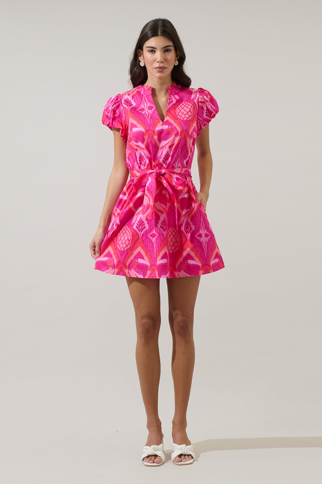 Twirl into fun with this Prissa Ikat Orela Shift Mini Dress! Short puff sleeves frame a split neckline. Keep it shift style or add the belt around the waist for a different look. Don’t forget to add on matching accessories.