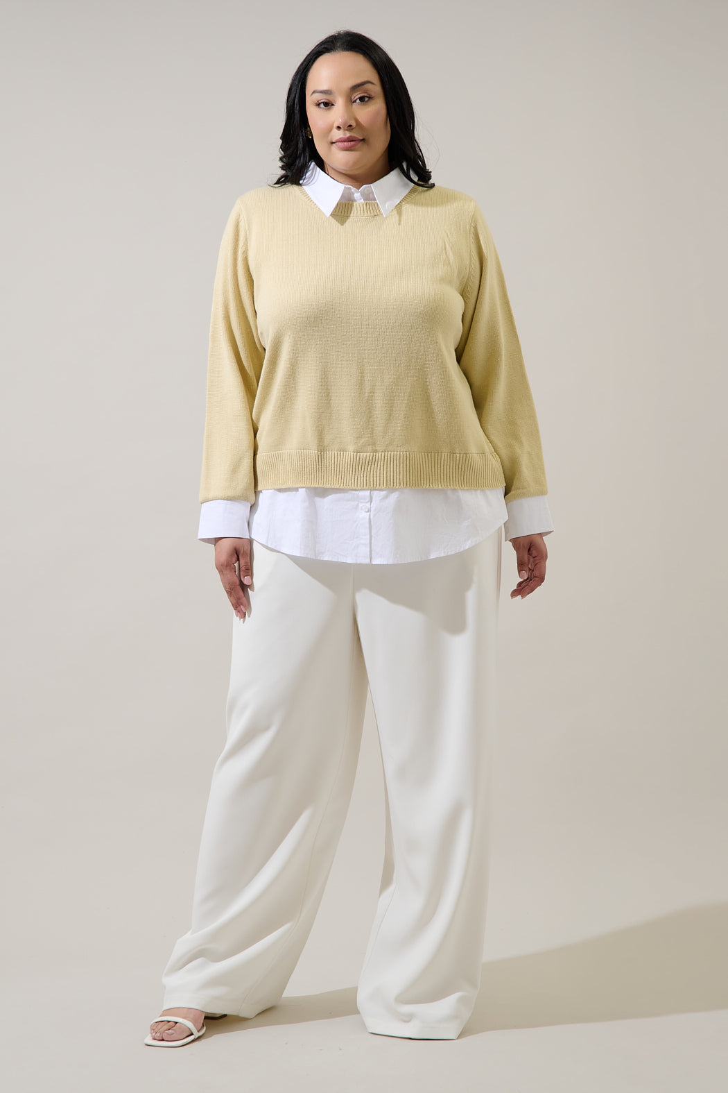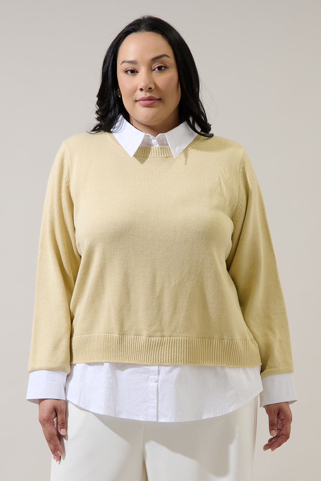 Stay stylish and comfy with this clever sweater that combines elegance and ease! Featuring a soft knit body with a built in collared shirt, it offers a relaxed fit for a chic layered look. Pair it with tailored trousers, loafers, and a sleek handbag for a polished office ready look or with skinny jeans and ankle boots for a more casual vibe.