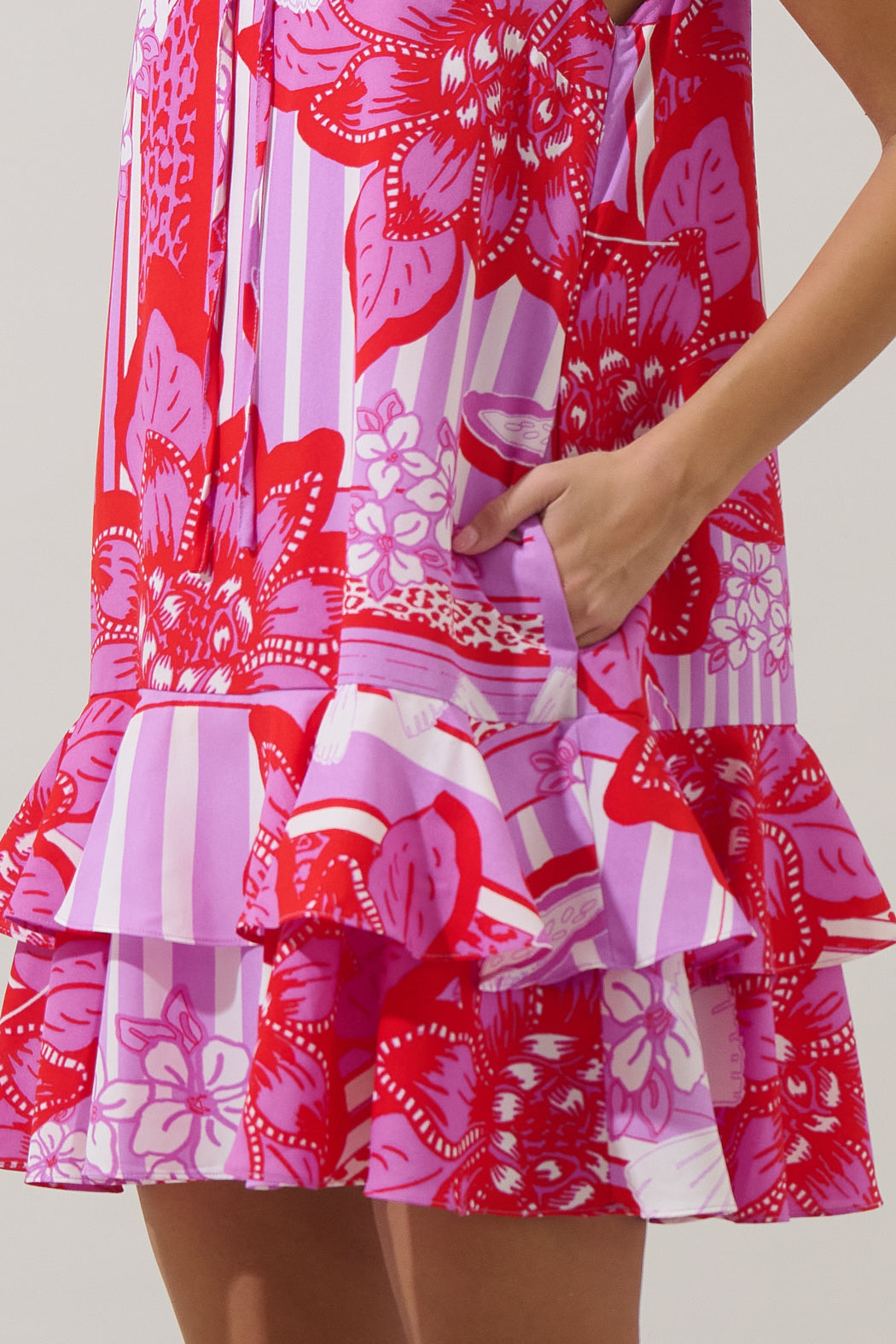 For the days you need to look chic without the fuss, reach for this fabulous floral dress. This sleeveless dress features a split neck tie detail that tops an A line silhouette. Side seam pockets are added for convenience, while a ruffle layered sweep adds a flirt flair. Go comfy and casual with flat sandals or elevate the look with strappy heels.