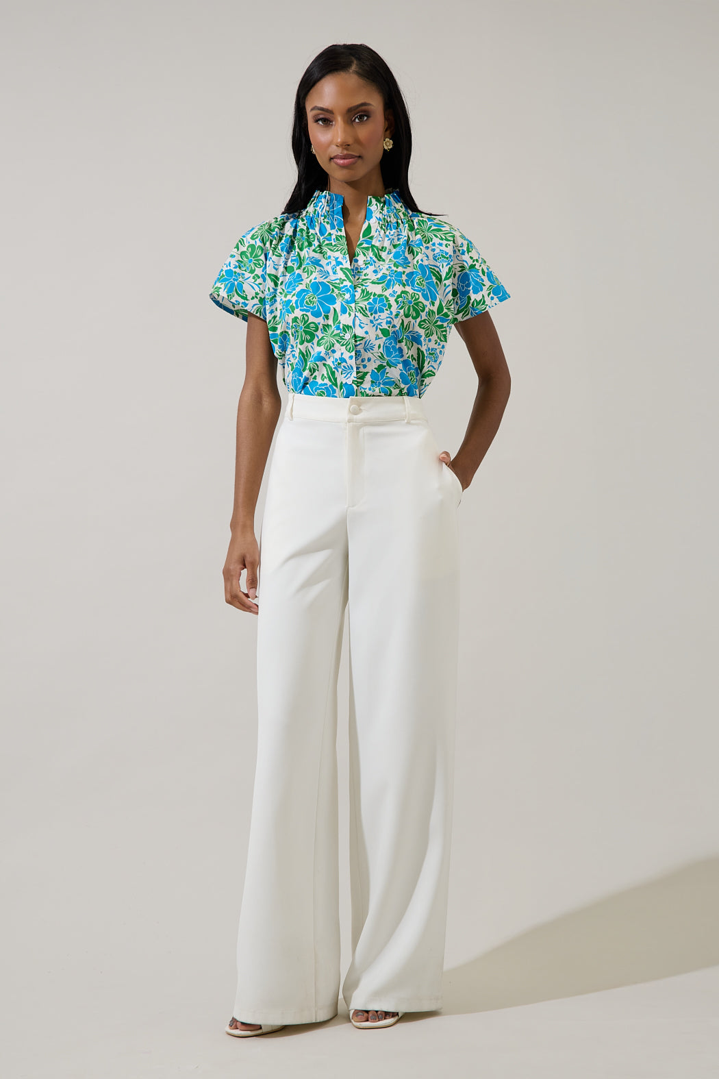 Prepare to fall in love with the Bivore Floral Patma Mock Neck Top. A floral print creates this mock neck top with a button up front. The dolman sleeves have small gathering at the shoulders. Pair it up with white pants or denim jeans for a complete look.