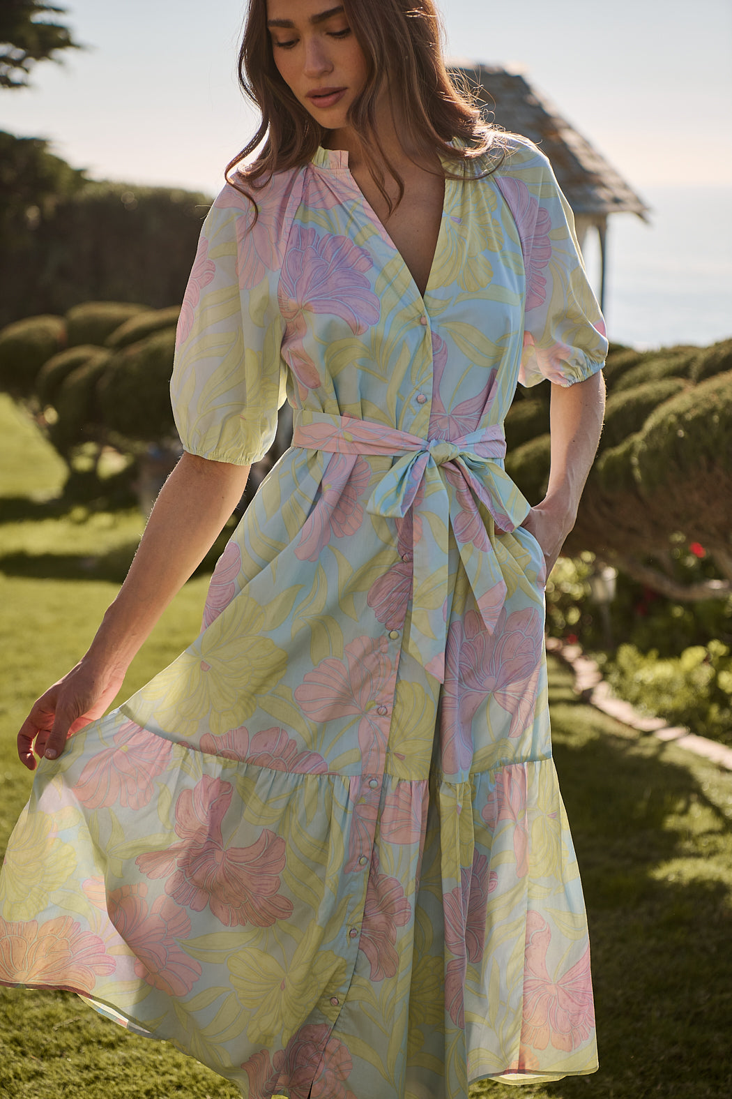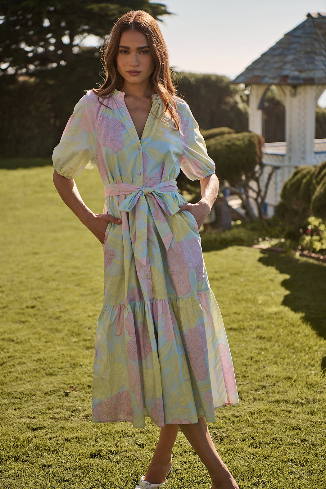Where pastel magic meets floral whimsy! Billowing puff sleeves join a classic style mid length dress with a functional button front. A waist tie adds shape, framing conventional side seam pockets. Pair the look with heels.