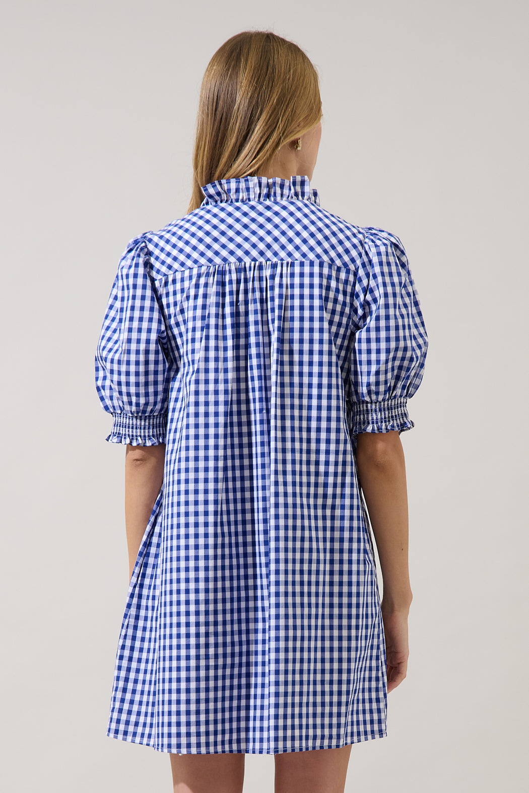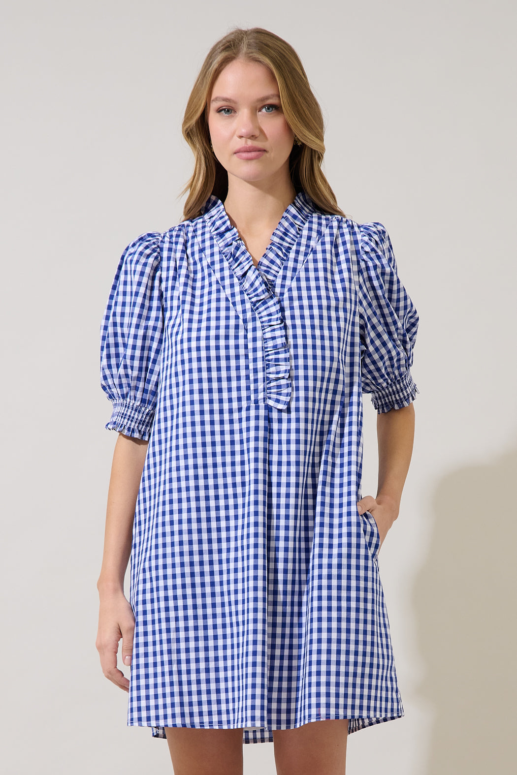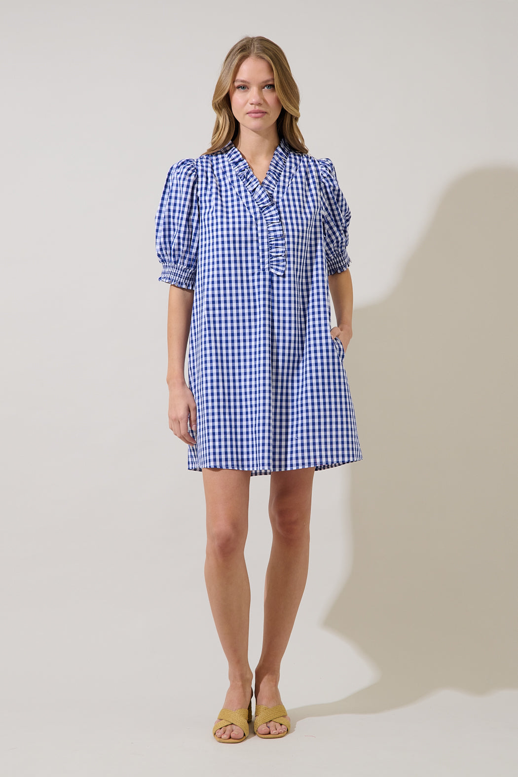 Make a timeless statement in this classic mini dress. A shift dress, designed with puff sleeves feature smocked cuffs for a comfortable fit, while the ruffled V-neckline adds a playful touch. Perfect for pairing with white heels or sandals.