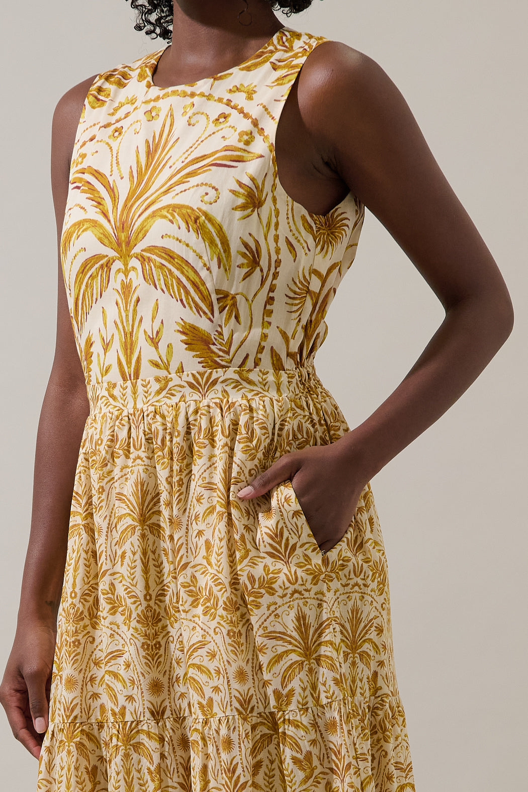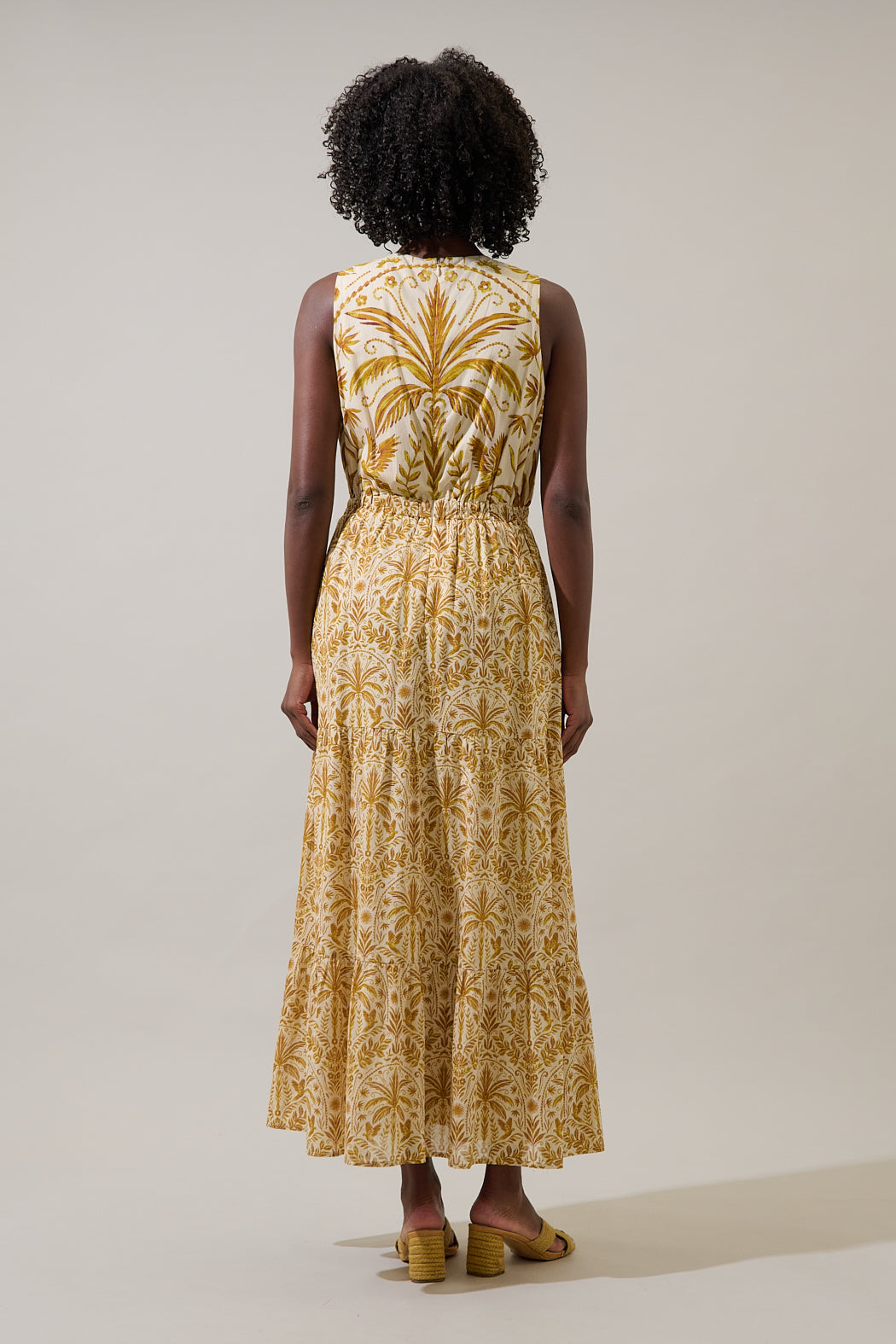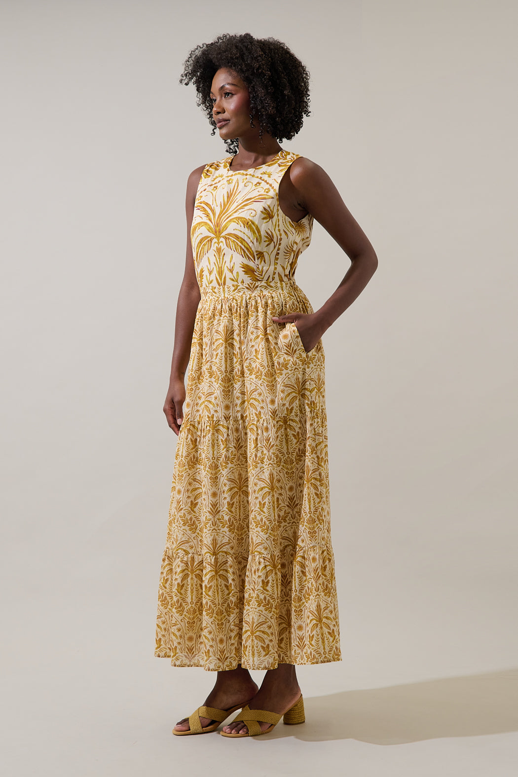Escape the everyday with the Calina Tropical Jivie Tiered Maxi Dress. It features a tropical print with a sleeveless design including subtle cutouts and tie details at the sides. The tiered skirt flows gracefully to a maxi length. Pair it with woven heels.