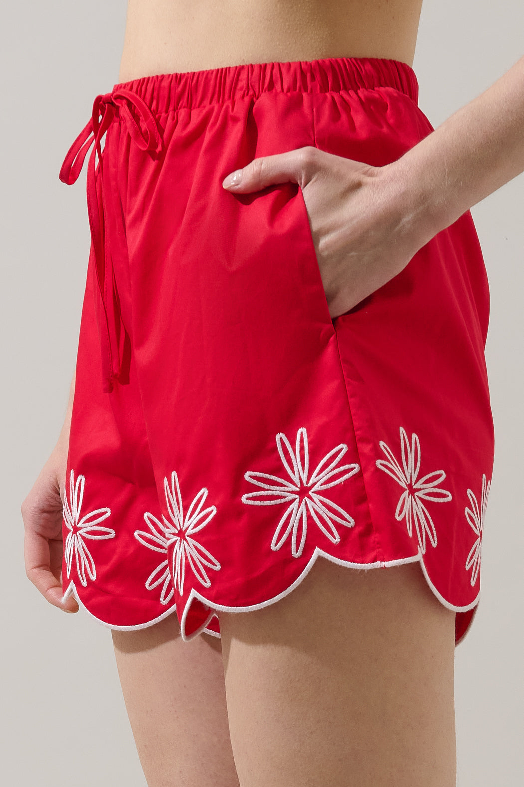 Bring the fun and flare with these shorts! They feature an elasticized drawstring waist and a bold scalloped flower embroidery along the hem. Pair them with the matching top for a full look.
