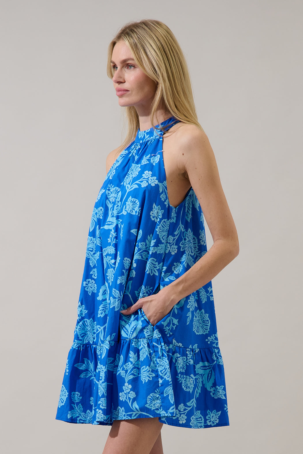 Blue florals, sunny moods, and compliments guaranteed. This dress features a high halter neckline that tops a sleeveless style. It maintains a shift silhouette, featuring a keyhole in the back. Wear it with a sun hat and strappy sandals.