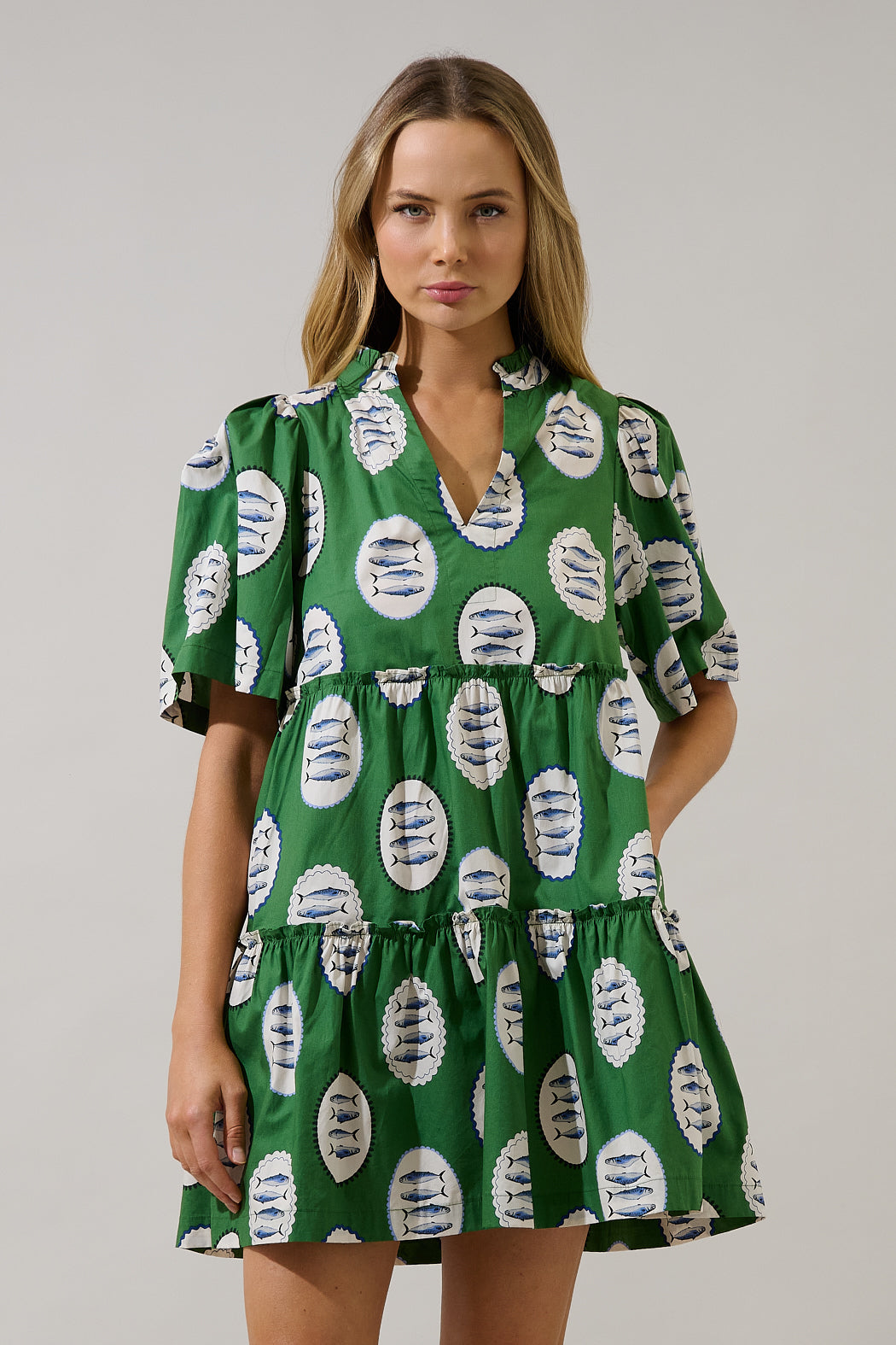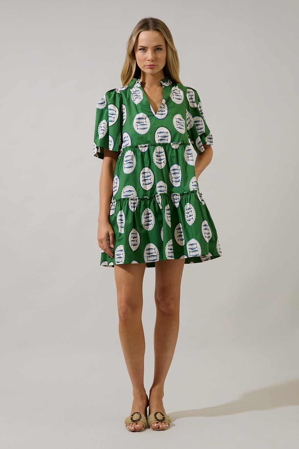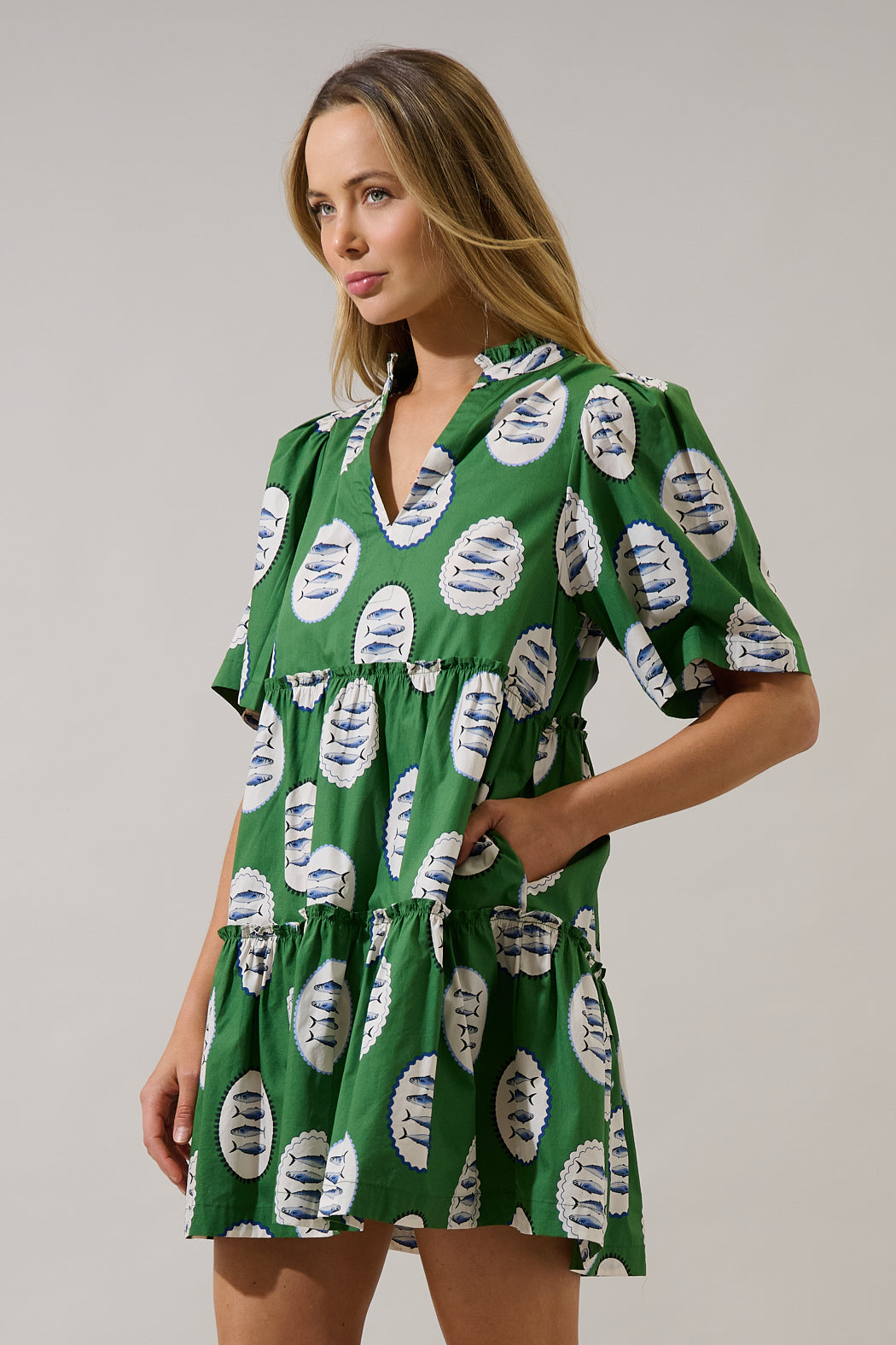 Green goddess energy! This mini dress is featuring a flattering split neckline and functional pockets, this dress combines style and practicality in a bold, easy-to-wear silhouette. Complete your look with heels.