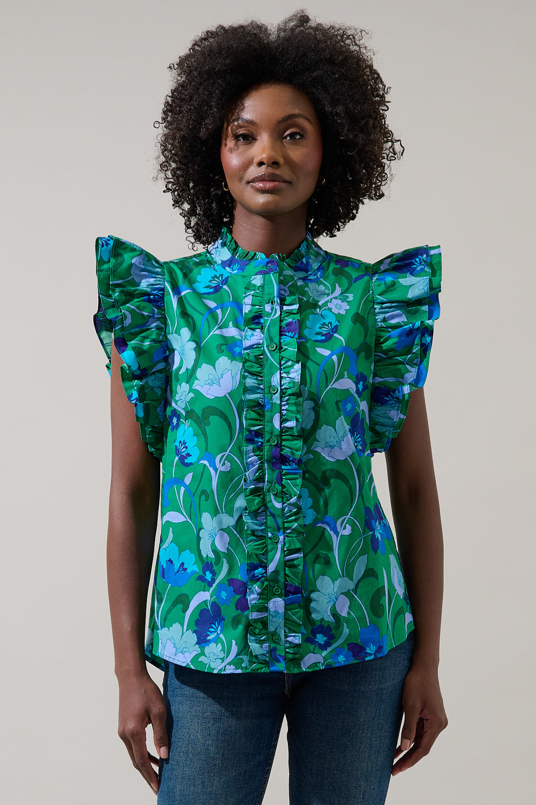 It's always fun in the sun with this top on! This poplin style top has a button up placket with ruffles that accent the neck and sleeveless, bodice. Easy to pair with black pants and cute heels.