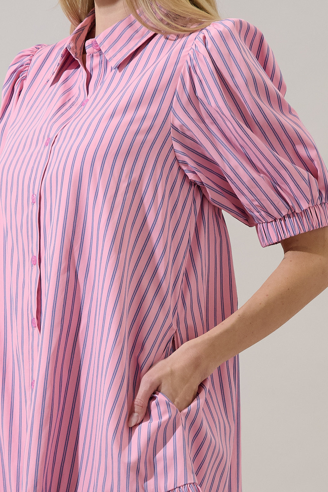 You can never go wrong with mini dresses. A striped dress with a classic collar that leads to a functional button front detail. Short, bubble sleeves frame a shift silhouette with a drop ruffle waist. Pair the look with any shoes of your choice.