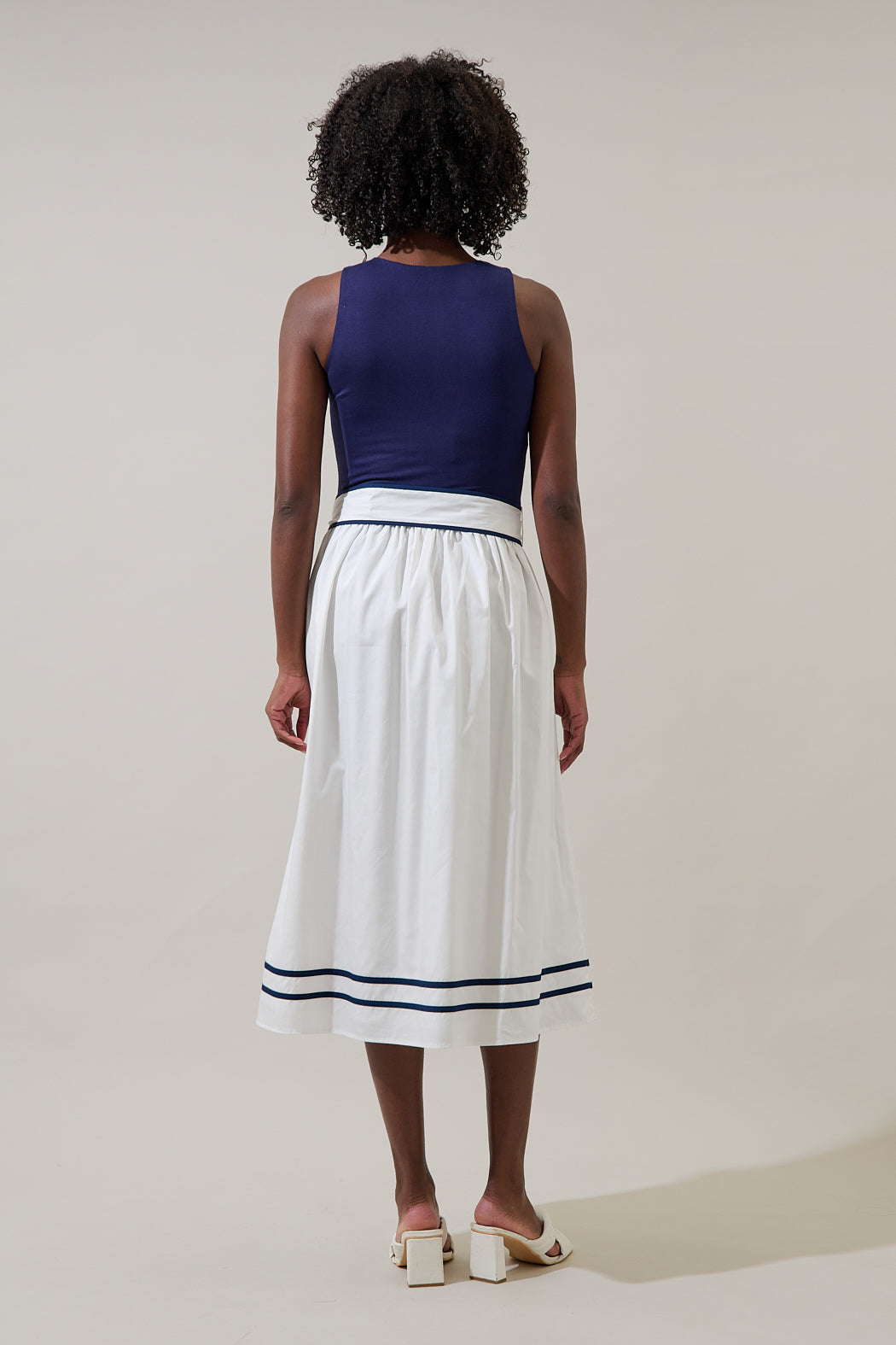 Embrace effortless elegance with this stunning dress. Featuring a classic sleeveless, fitted top that gives way to a flowing A-line skirt. The bold white bow belt, finished with navy piping, cinches the waist for a flattering and feminine silhouette. Pair it with any heels of your choice.