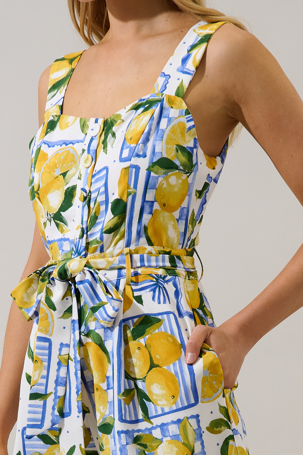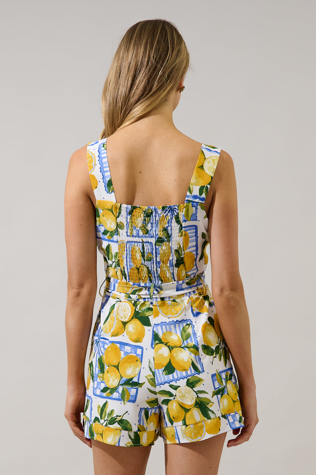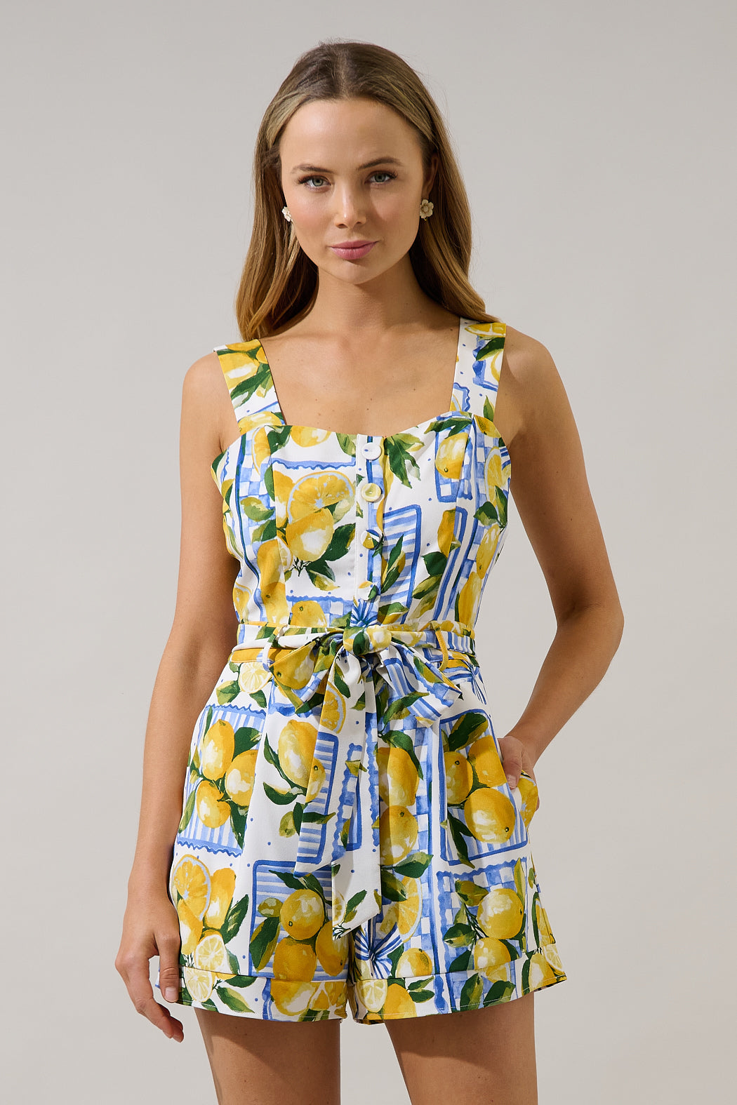 A little citrus, a lot of summer fun. This playful lemon print romper features a flattering square neckline, button front detail, and an adjustable tie waist for the perfect fit. Finished with a tailored yet easy silhouette and functional pockets. Easy to pair with heels or sandals.