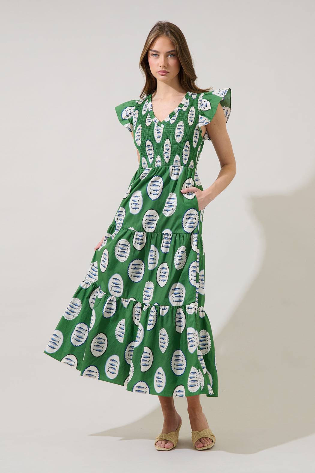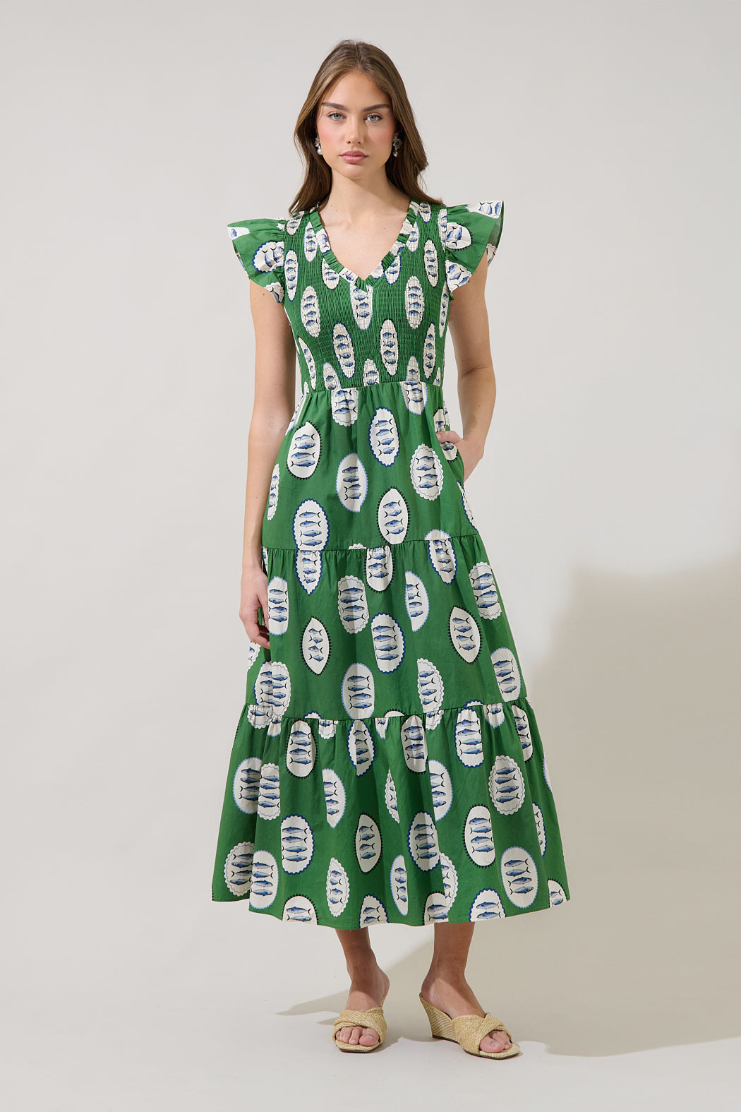 Fresh, flirty, and made for sunshine. It features a flattering smocked bodice with a ruffle V neckline, framed by ruffle cap sleeves. It maintains a fit and flare silhouette with a tiered maxi skirt. Wear sandals or heels to go along.