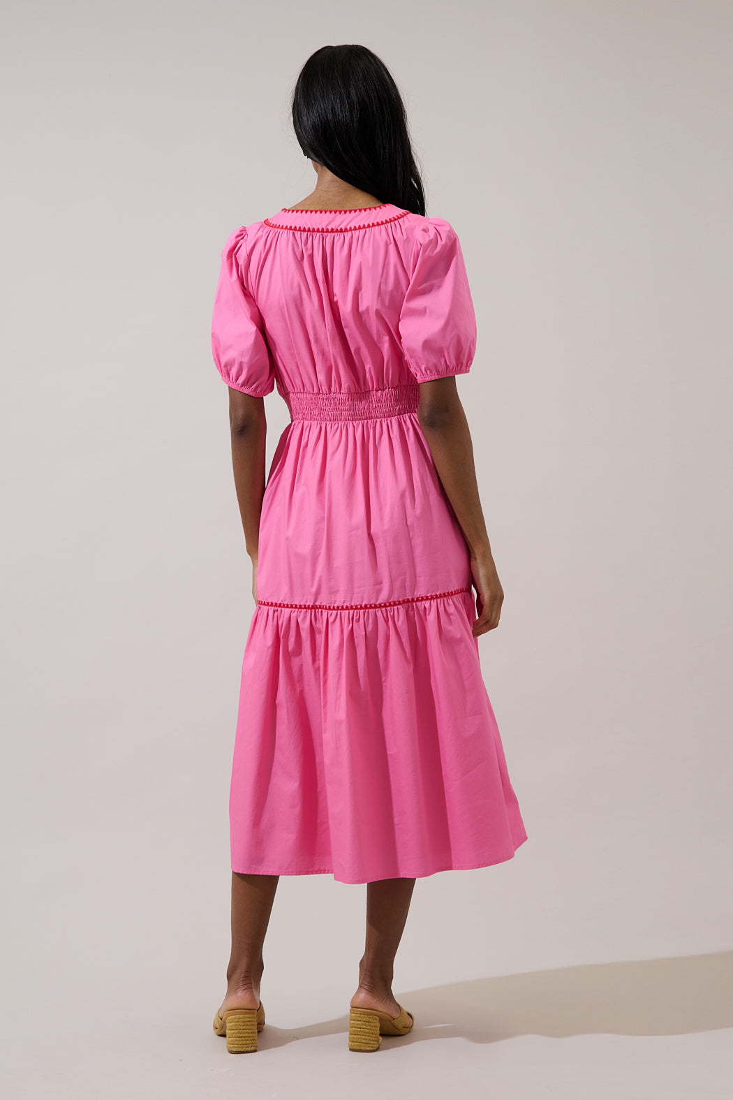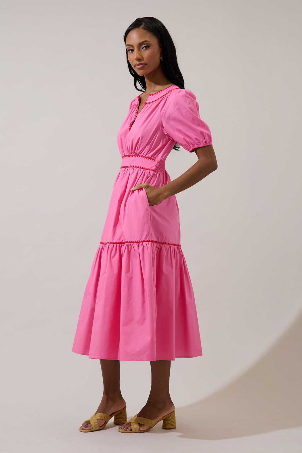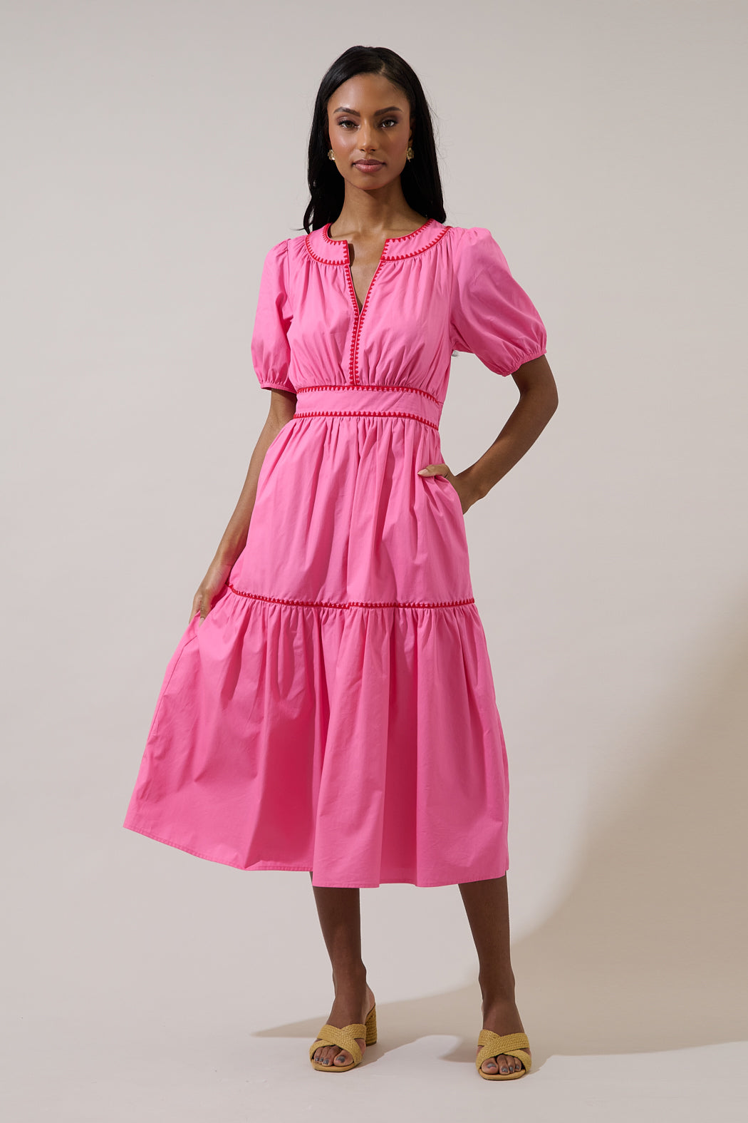 Effortlessly chic and beautifully tailored, this navy midi dress is a timeless piece for any wardrobe. Crafted from a lightweight cotton-blend fabric, it features delicate white embroidered trim along the neckline, bodice, waist, and skirt tiers. Pair it with strappy sandals for a classic summer look or dress it up with wedges and a clutch for a polished occasion.