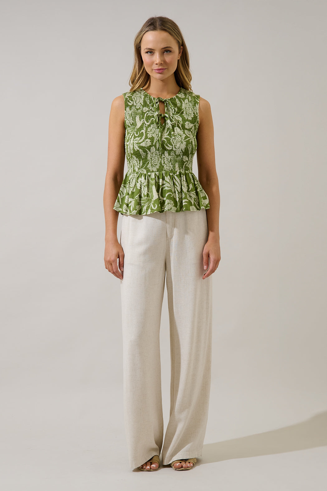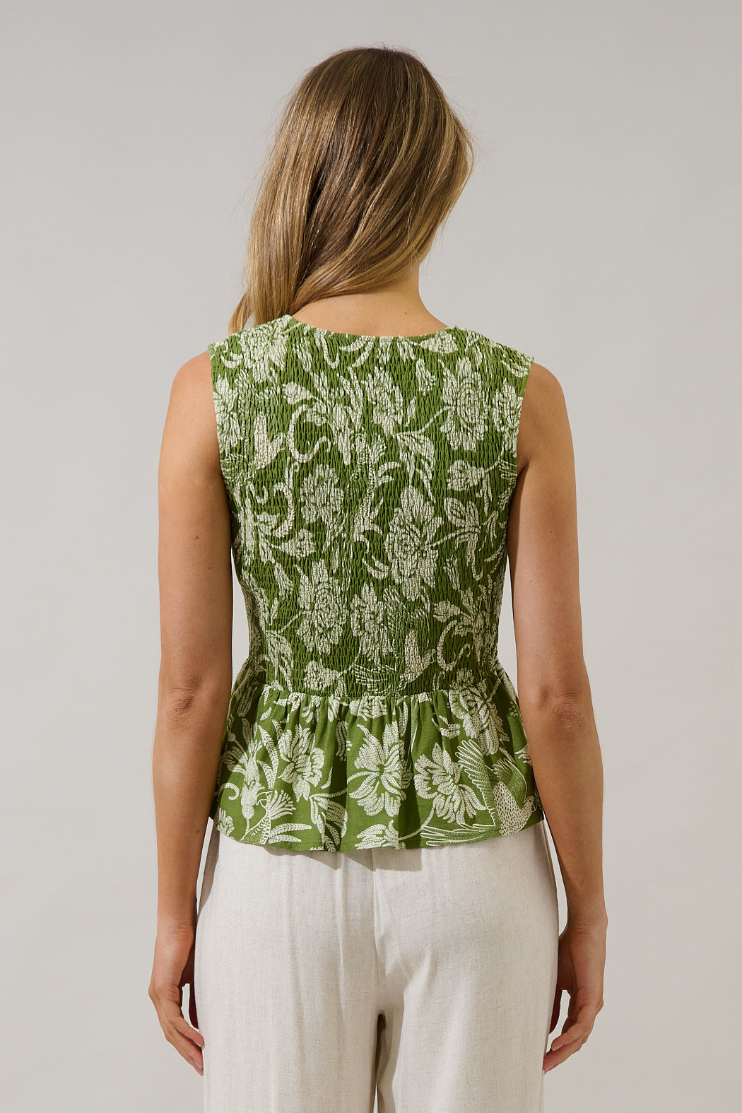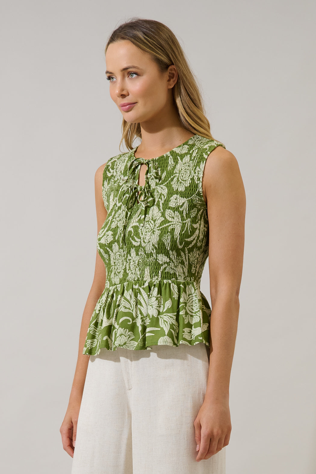 Start your day off right in this floral top. The smocked bodice offers a comfortable, fitted silhouette, while the peplum hem adds a flirty, feminine flair. Perfect for pairing with jeans and heels.