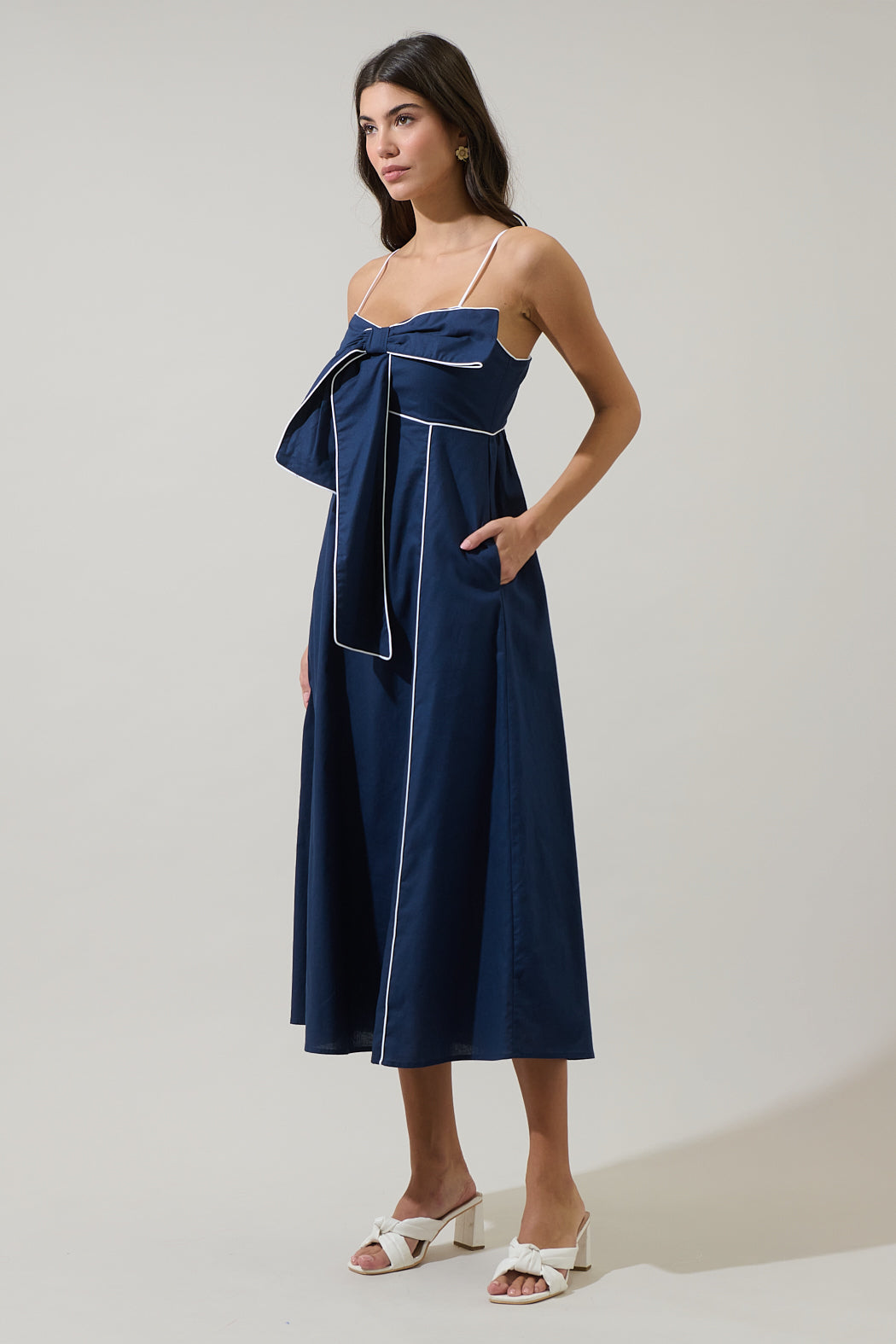 Step out in timeless chic with this midi dress, defined by its contrasting white piping that traces the silhouette. It features a strapless sweetheart neckline with spaghetti straps and a dramatic oversized bow detail at the bust. A flattering A-line skirt with functional side pockets completes this perfect dress for a summer event.