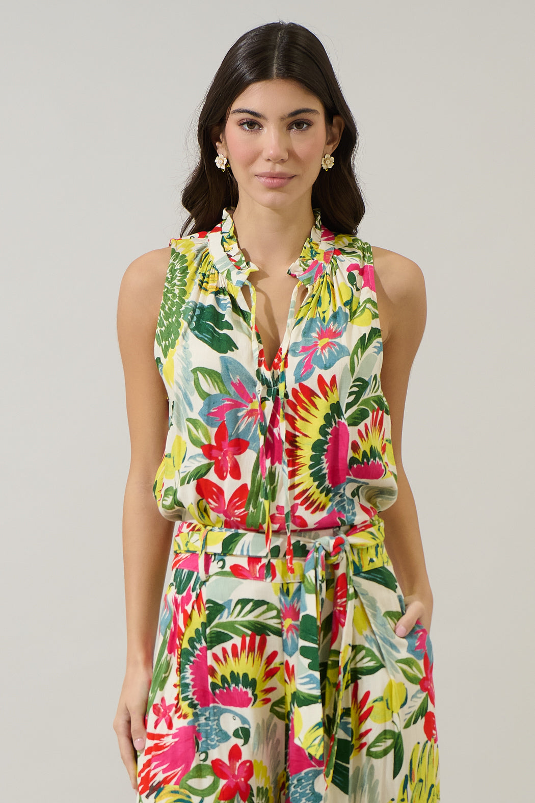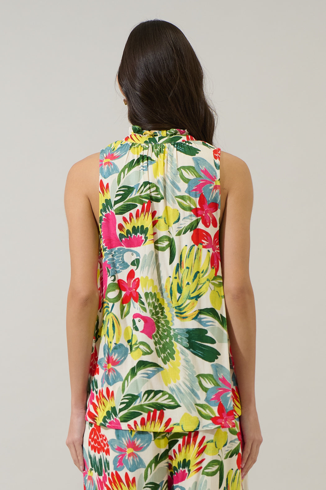 Ready for your next getaway? Meet your new favorite resort dress. A tropical floral print on this blouse features a sleeveless look, mock neck, and a string tie around the neck. You can easily pair it up with the matching shorts for a full set.
