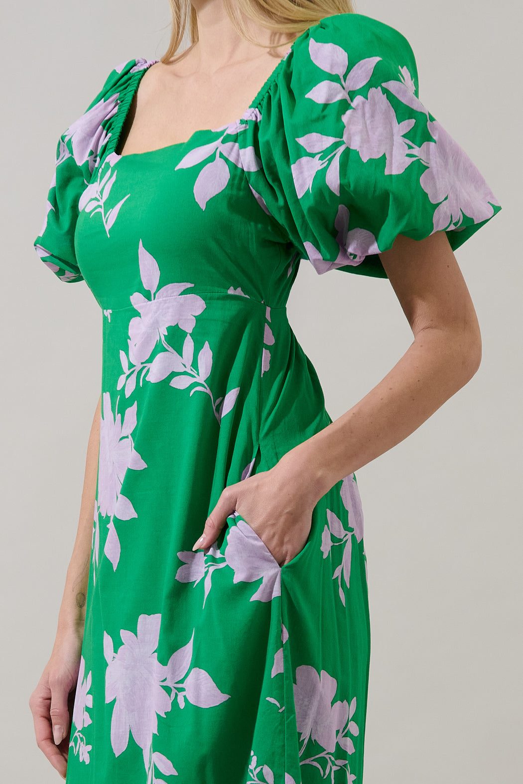 Bloom bold in this pretty dress that feels like spring on you. An empire high waist takes on this midi dress with bubble short sleeves. The back side has a smocked panel with an invisible zipper. It ends with a nice hem at the end. Pair it with your favorite heels to go along.