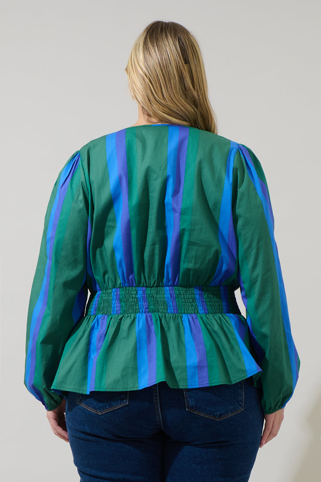 Elevate your wardrobe with this must have top that combines style and comfort effortlessly! It features long balloon sleeves, a flattering split neckline, a smocked waist, and a peplum hem, all in a striking striped and color block pattern. Pair it with skinny jeans and knee high boots for a chic, casual look.
