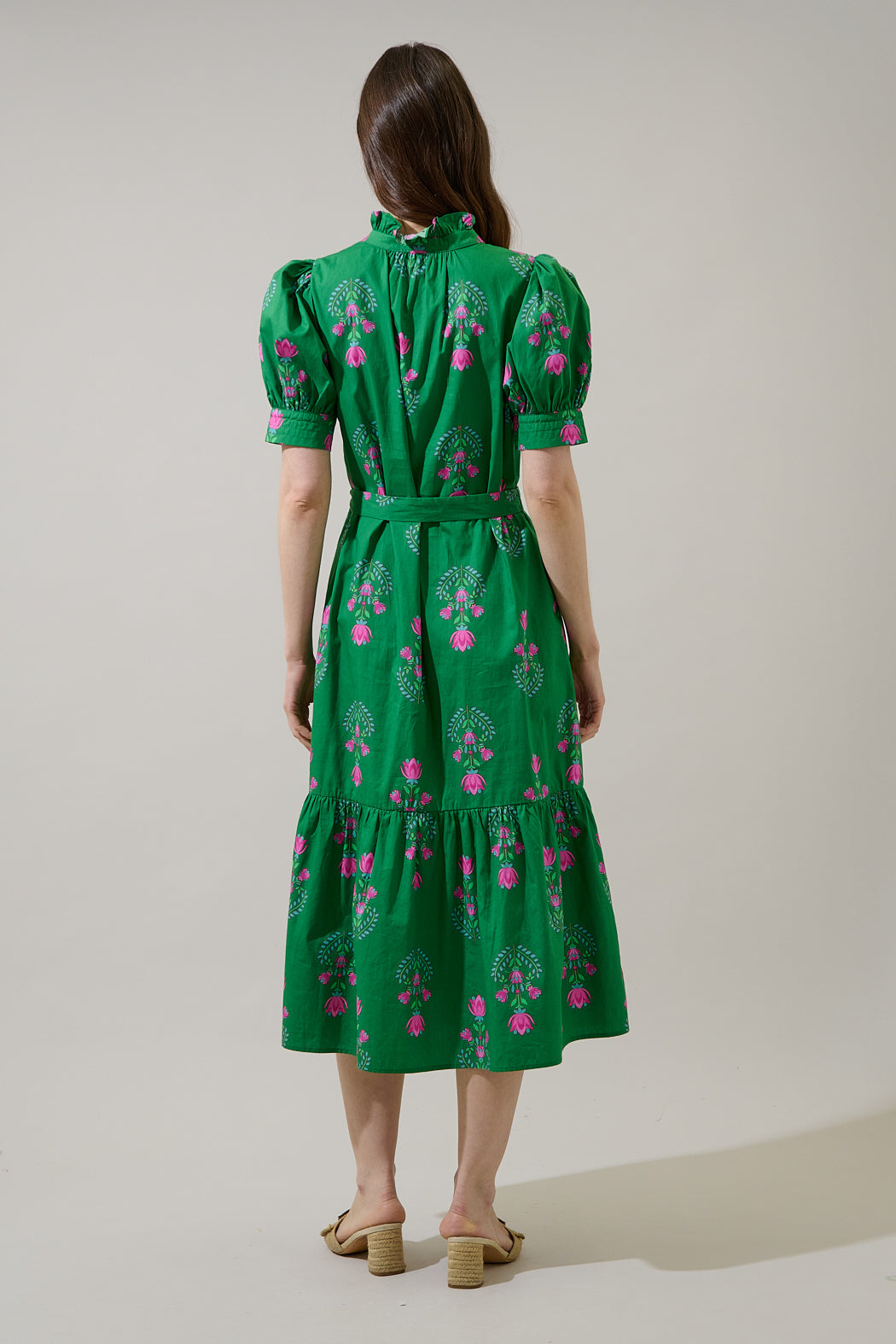 The kind of dress you’ll reach for every time you want to feel pretty .A ruffled mock neck follows short bubble sleeves, with a button up midi bodice. A belt around the waist can be tied and adjusted to your liking. Pair with heels or boots that match along to create a full look.
