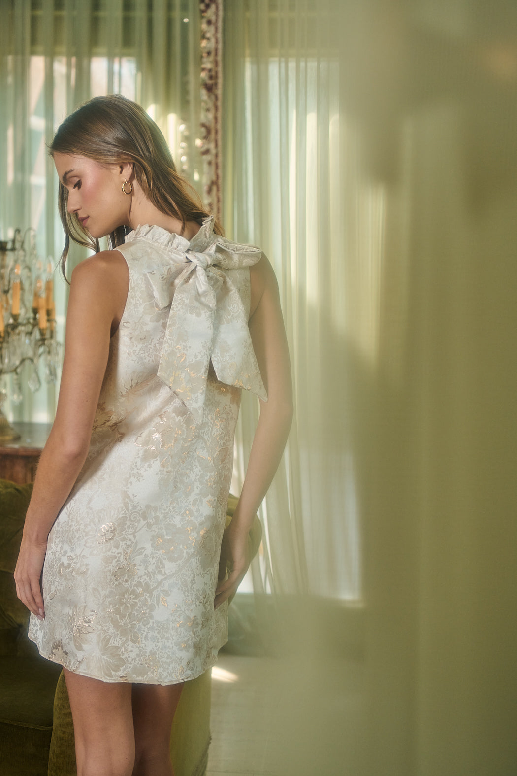 Feel confident and in style when you wear the Jaiyana Jacquard Benson Trapeze Mini Dress. It features a high ruffle mock neck that maintains a groovy A line silhouette. The back highlights a fun bow tie detail. Add strappy heels to complete you look.