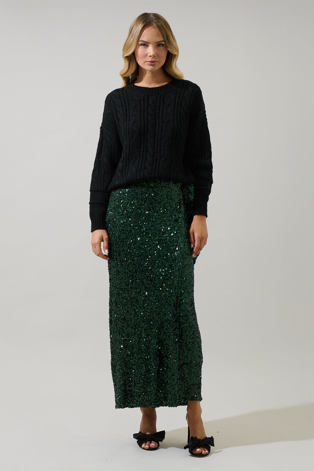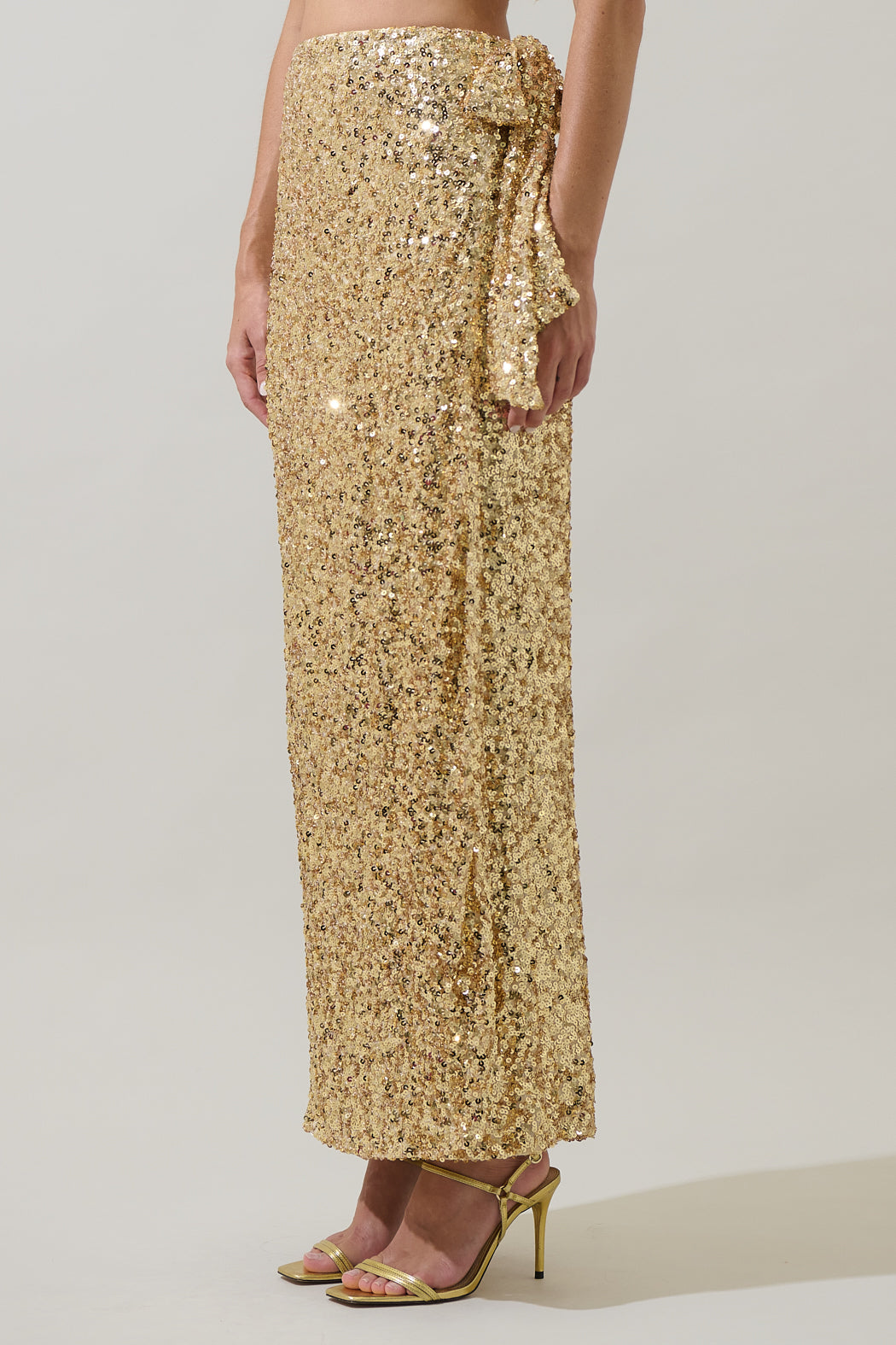 Shimmer from every angle in this dazzling sequin wrap maxi skirt. Designed with a flattering wrap silhouette, it drapes elegantly for movement and style, making it perfect for nights out or any occasion that calls for sparkle.