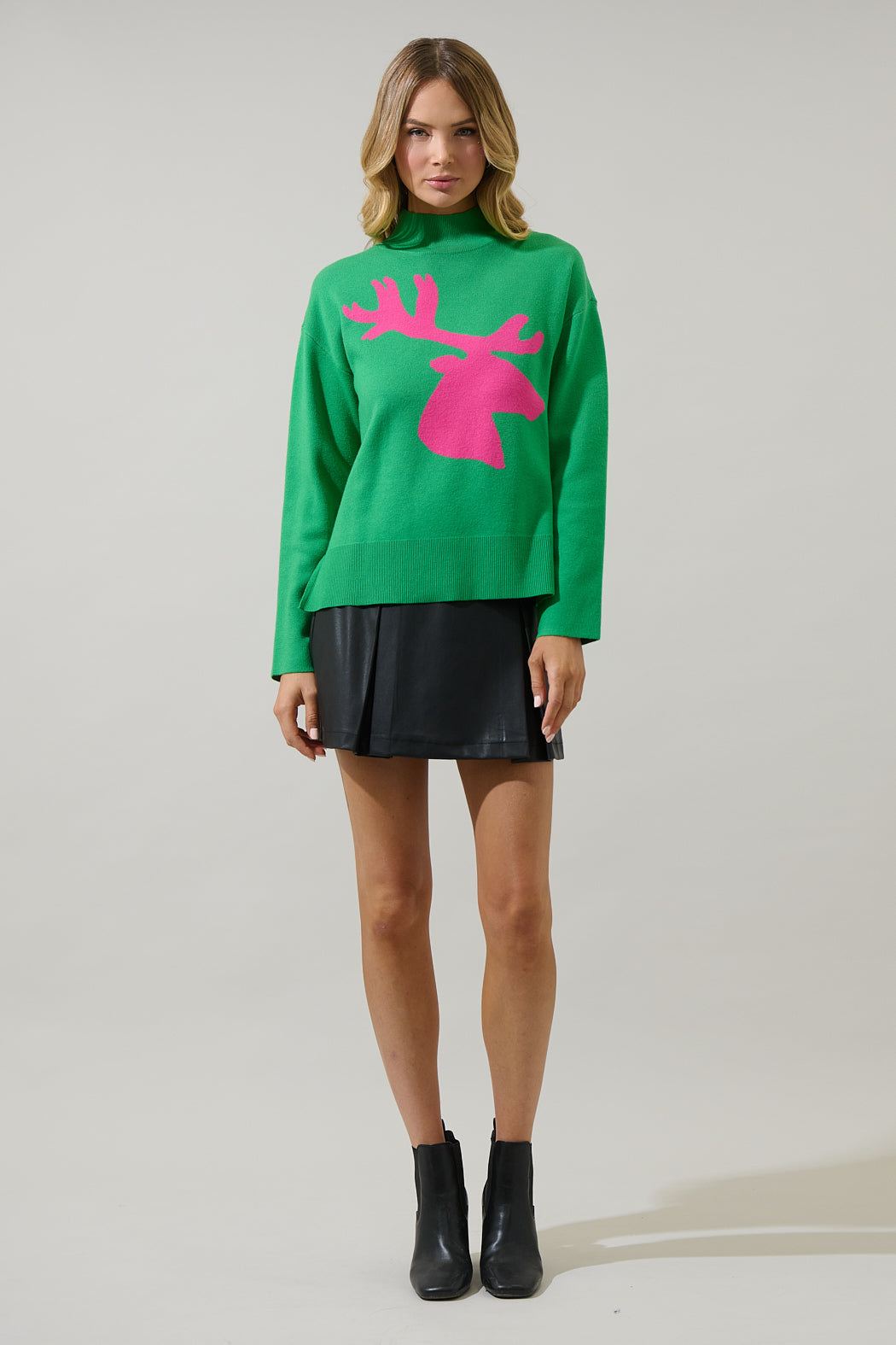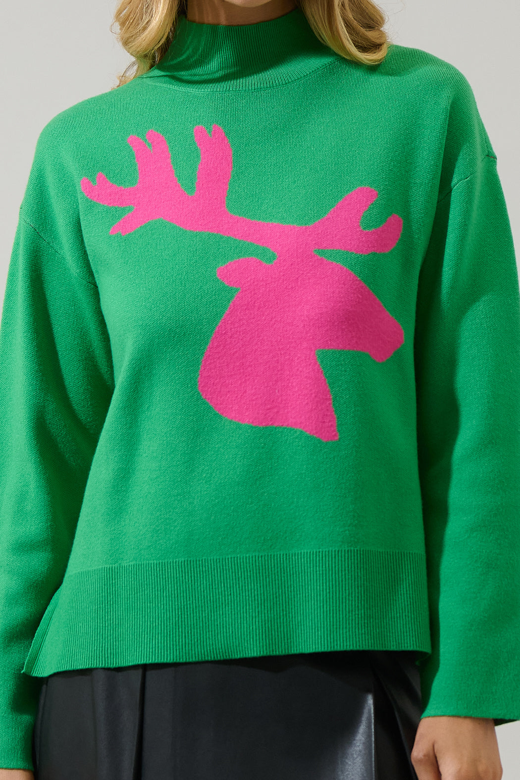 Make every casual day feel special in this cozy and whimsical sweater. Designed with a mock neck, long sleeves, relaxed fit, ribbed trim, and a vibrant pink moose graphic on a rich emerald background. Complete the look with leather skirts, ankle boots, and a playful crossbody bag for an on trend winter outfit.