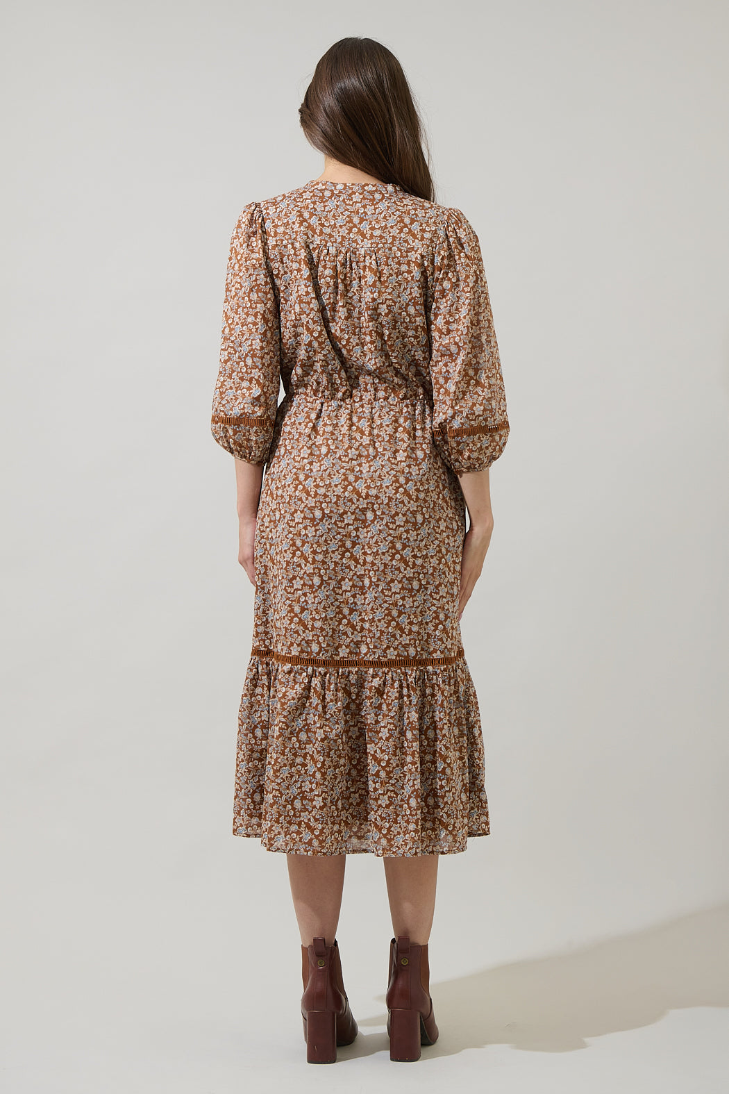 Fall in love with the charm of this floral midi dress. The flowy tiered skirt and puffed sleeves add a touch of romance. A sweet tie waist flatters your shape, and the soft notch neckline makes it effortlessly feminine. Perfect for garden strolls, weekend brunch, or simply twirling the day away.