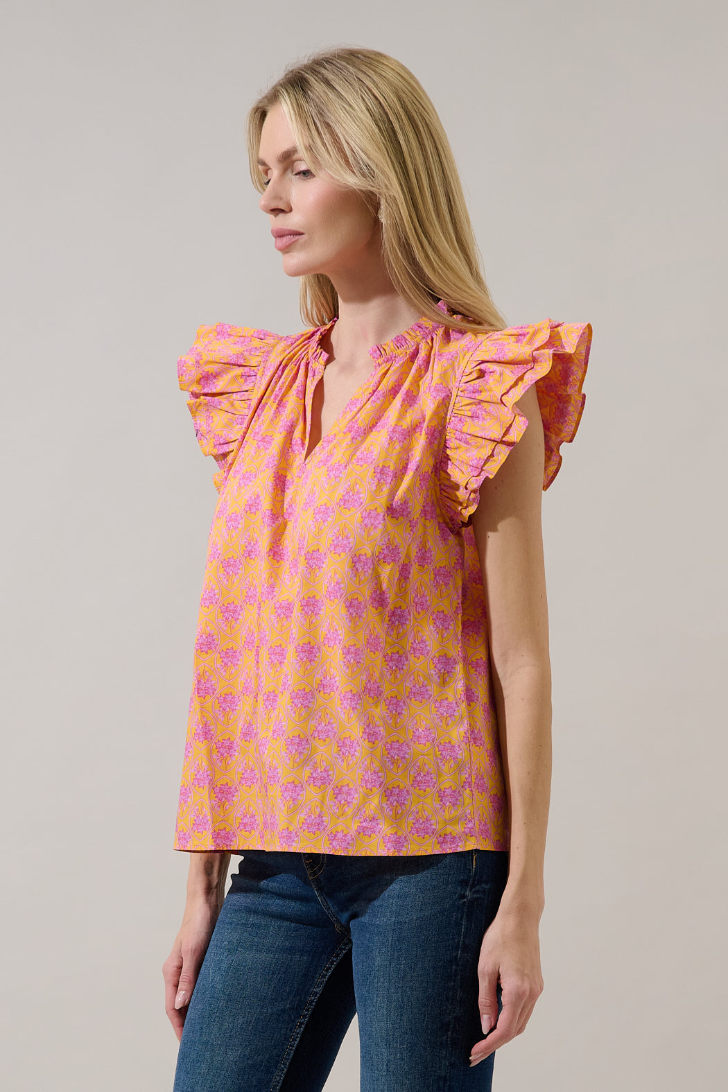 Risette Ruffle Split Neck Top Drift Floral