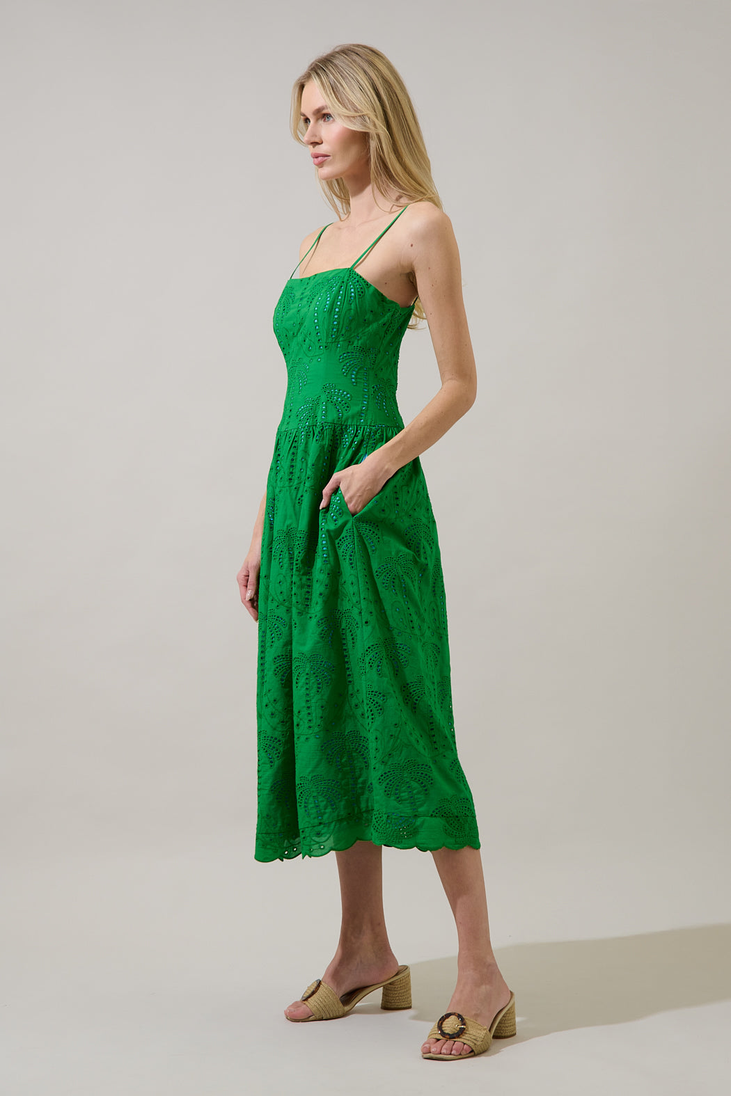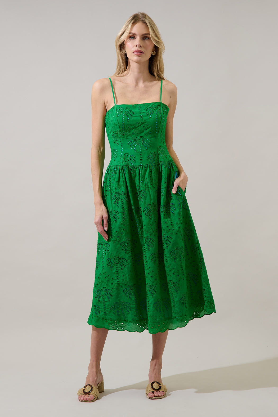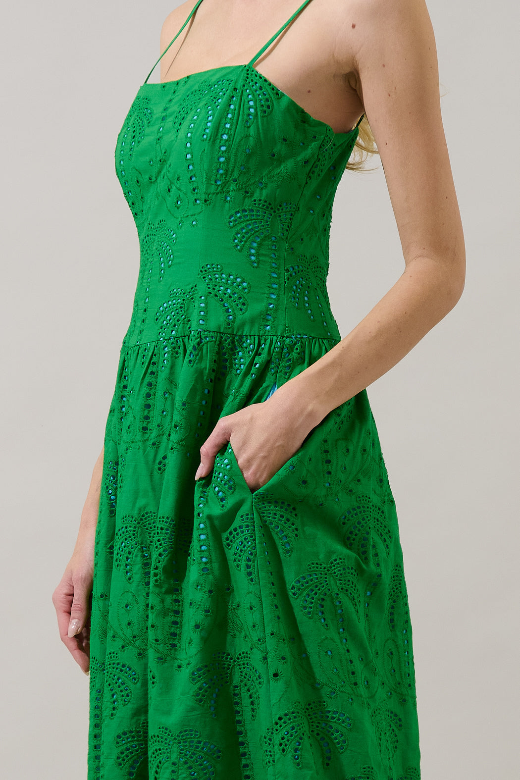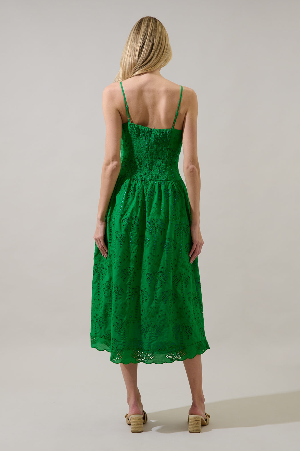 Turn heads in this vibrant green eyelet midi dress, made for sunny days and warm nights. Designed with delicate spaghetti straps, a fitted bodice, and a softly flared skirt. The intricate eyelet embroidery and scalloped hem add a romantic finish. Easy to pair with heels.