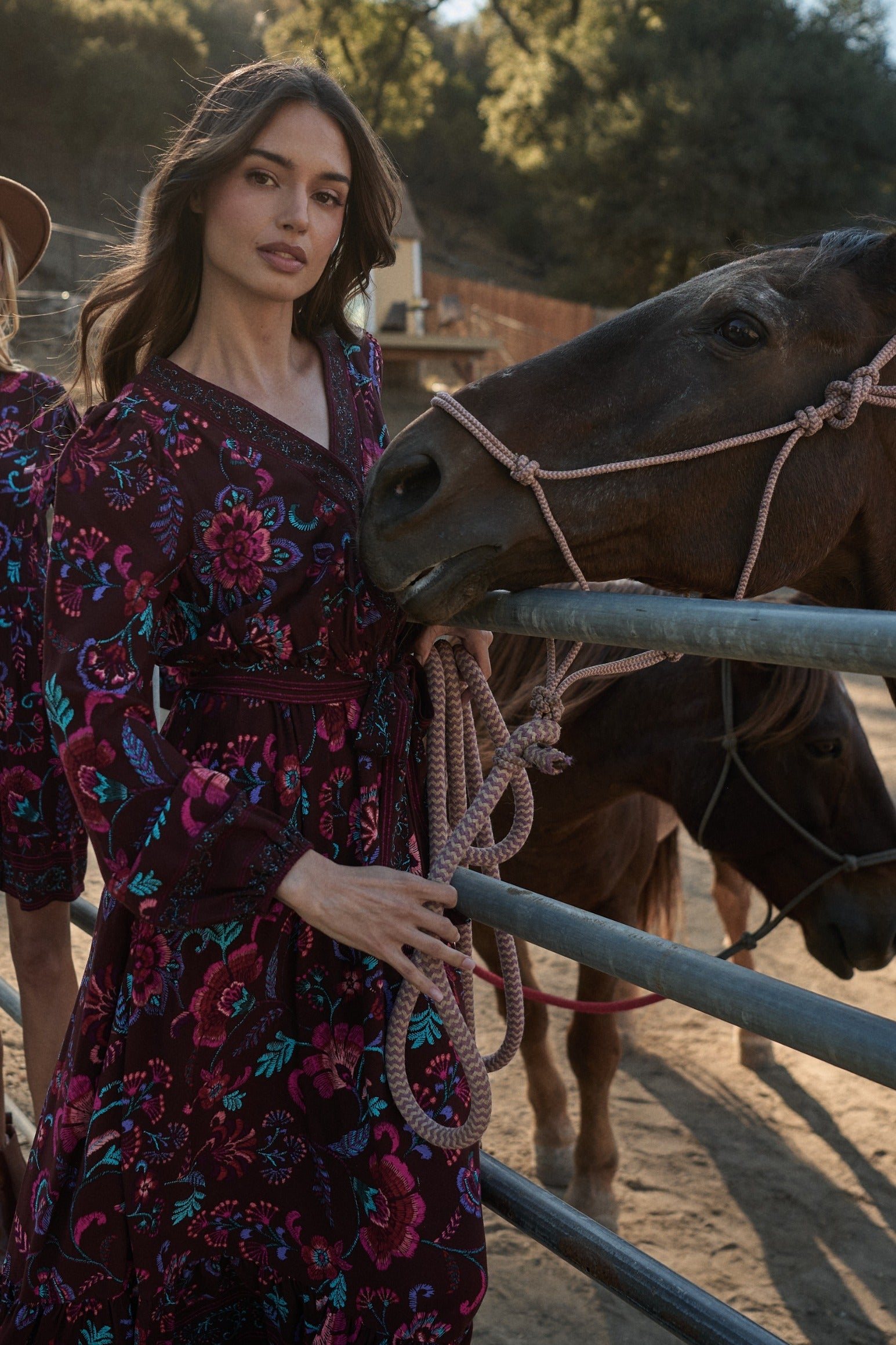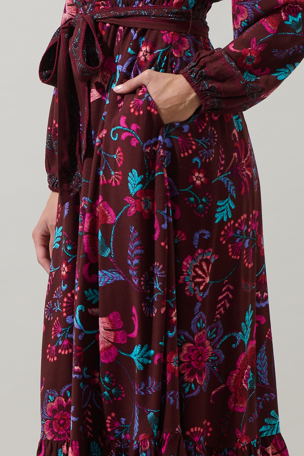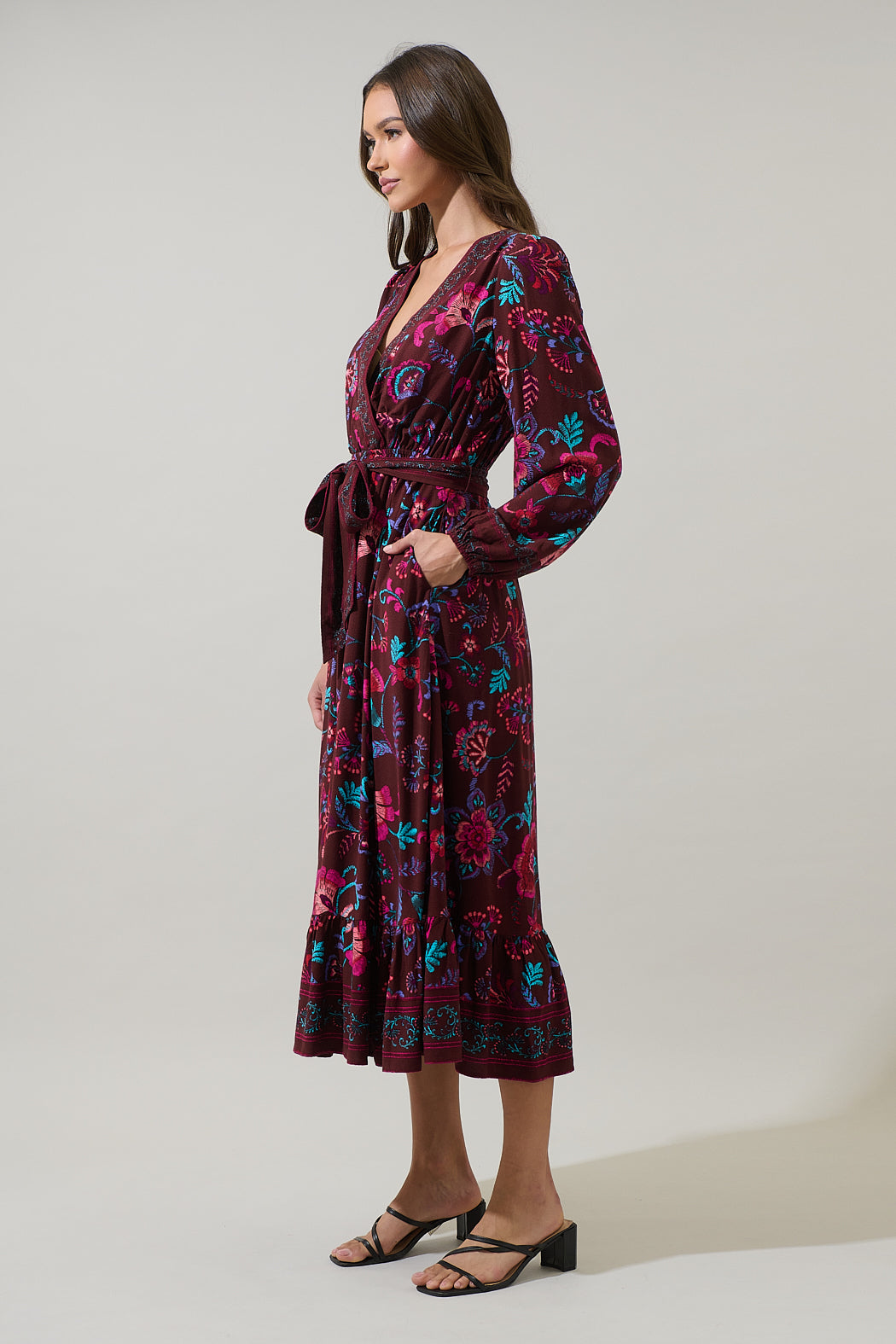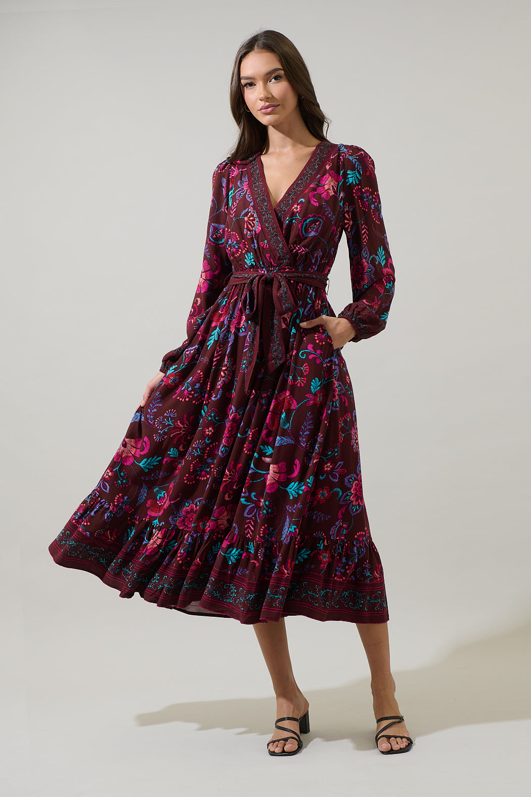 Introducing the Tory Paisley Mindie Wrap Midi Dress, the perfect blend of a brown base color adorned with a vibrant, intricate floral and paisley print. It features long sleeves framing a wrap top with a stretchy waistband, and a belt. Wear it with black strappy heels for any occasion.