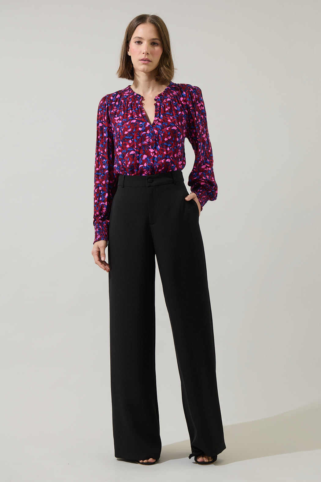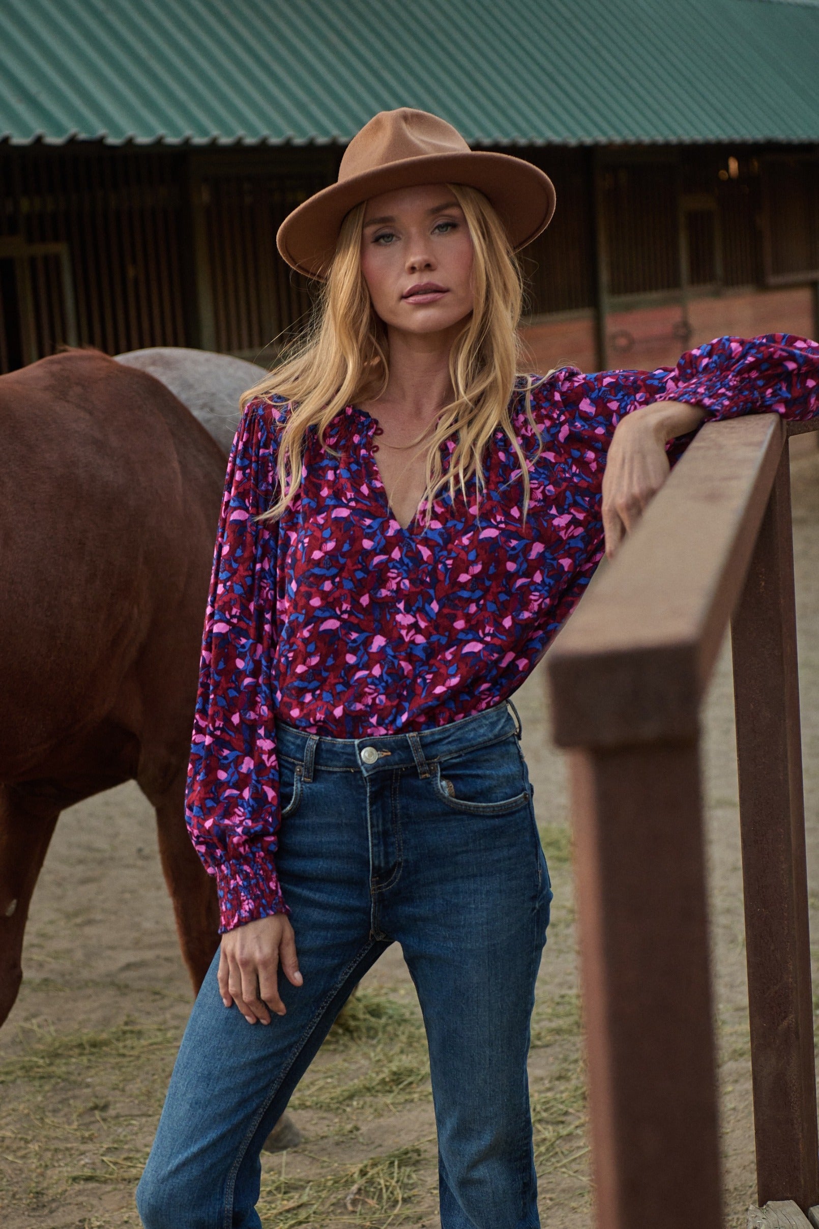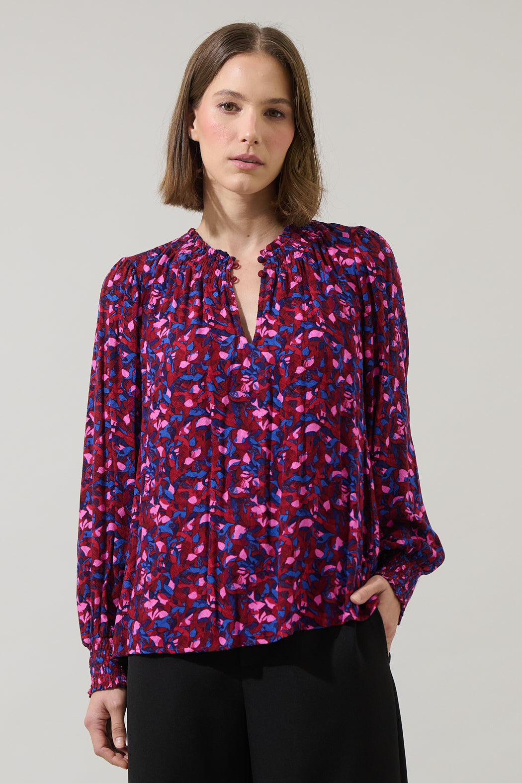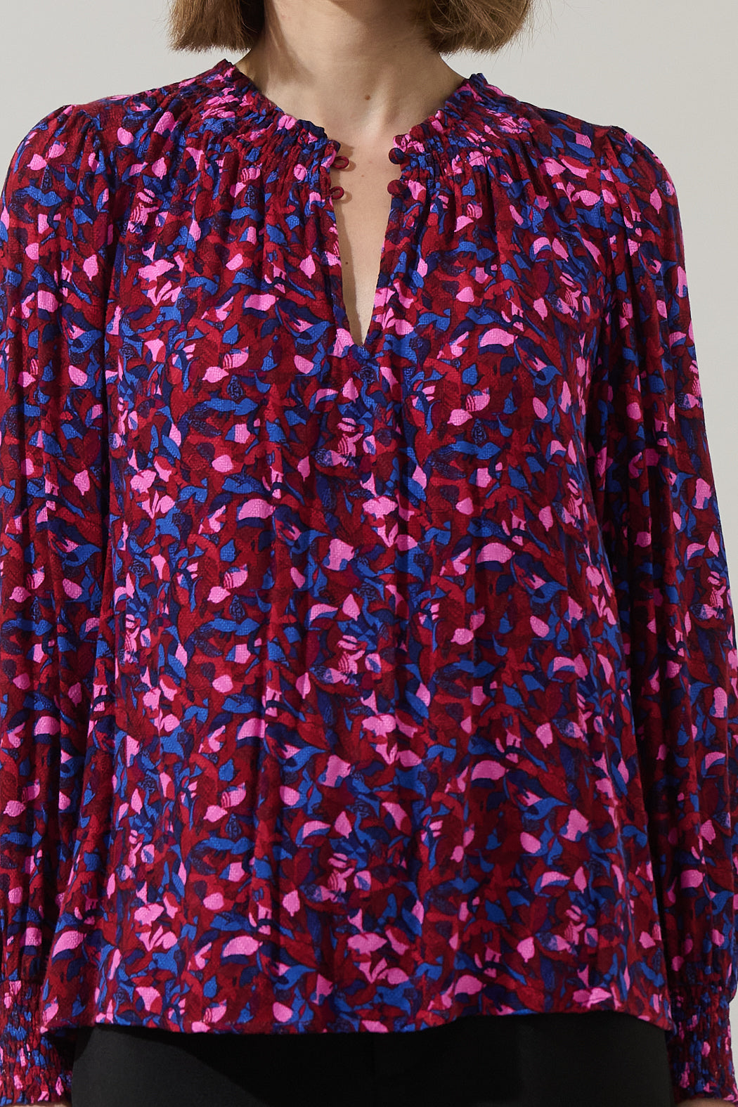 You will love how easy the Turma Abstract Jania Ruffle Top is to style. A cute floral design enchants long balloon sleeves with smocked cuffs and neck area. Keep it open or close the front button to create a keyhole. Pair it with wide leg denim and heels.