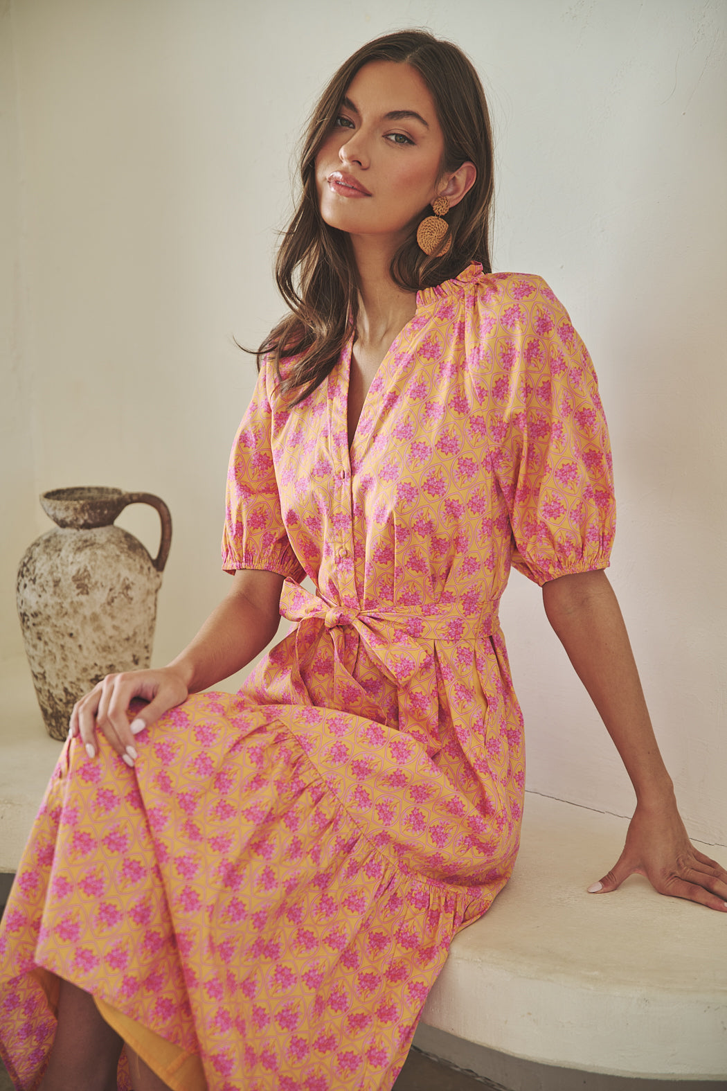 Set the tone for summer by greeting the season in this timeless dress. Billowing puff sleeves join a classic style mid length dress with a functional button front. A waist tie adds shape, framing conventional side seam pockets. Pair the look with heels.