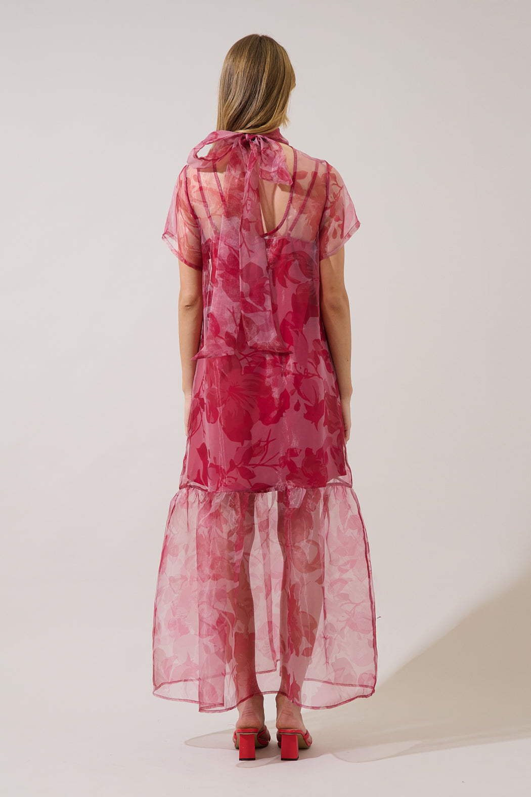 Chic from head to toe! It has sleek organza composition that lays on top of an adjustable spaghetti straps long cami dress, and a long-collared neck. Turn around to reveal an oversized bow detail at the back for an extra-dramatic finish!