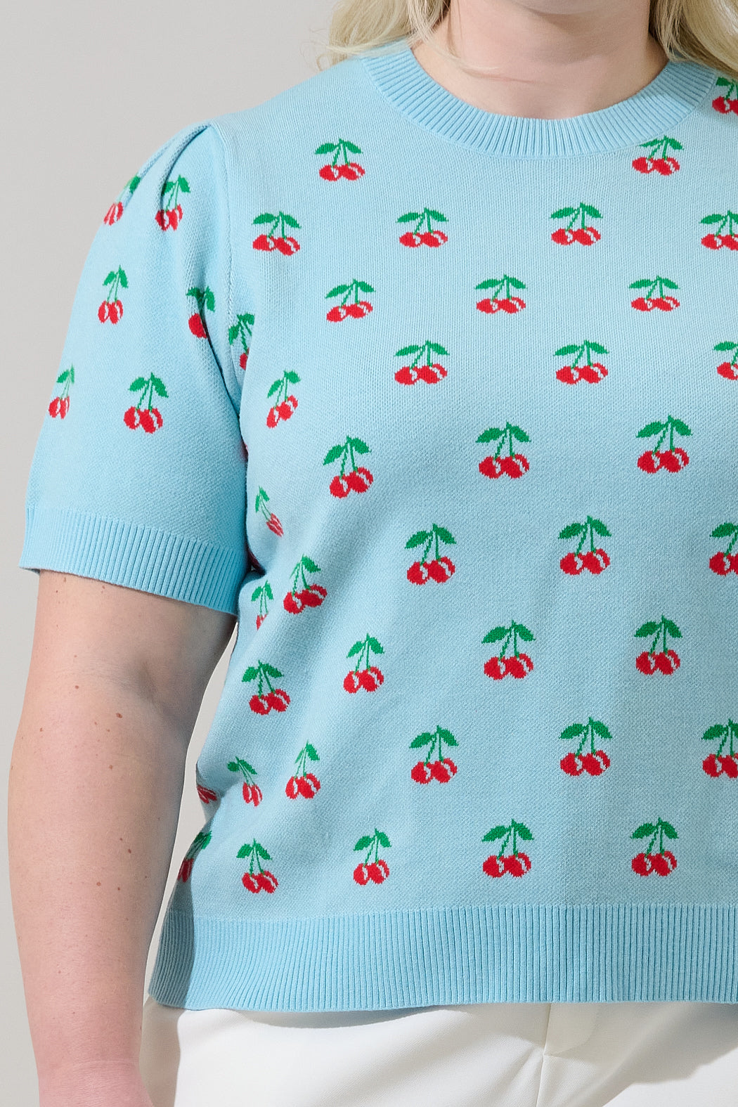 Dive headfirst into adorable with the Cherryville Short Sleeve Sweater Top. This delightful light blue sweater features a playful red cherry pattern, short puff sleeves, and a ribbed crew neckline. Pair it with denim jeans and white sneakers.